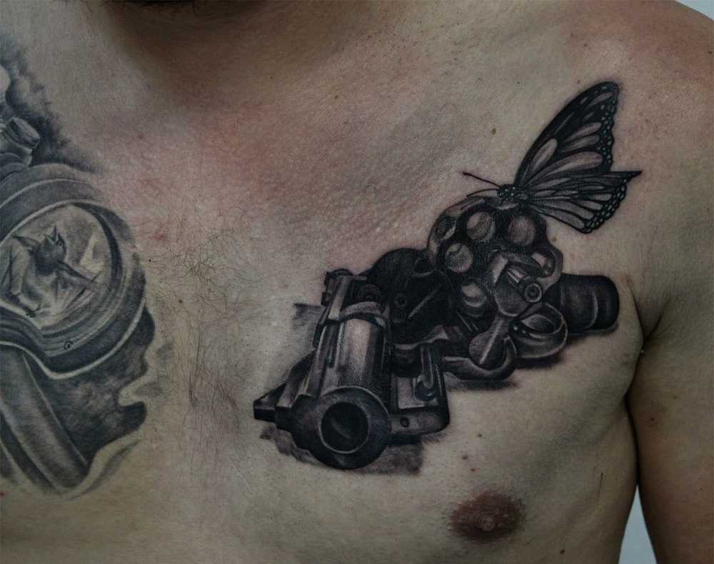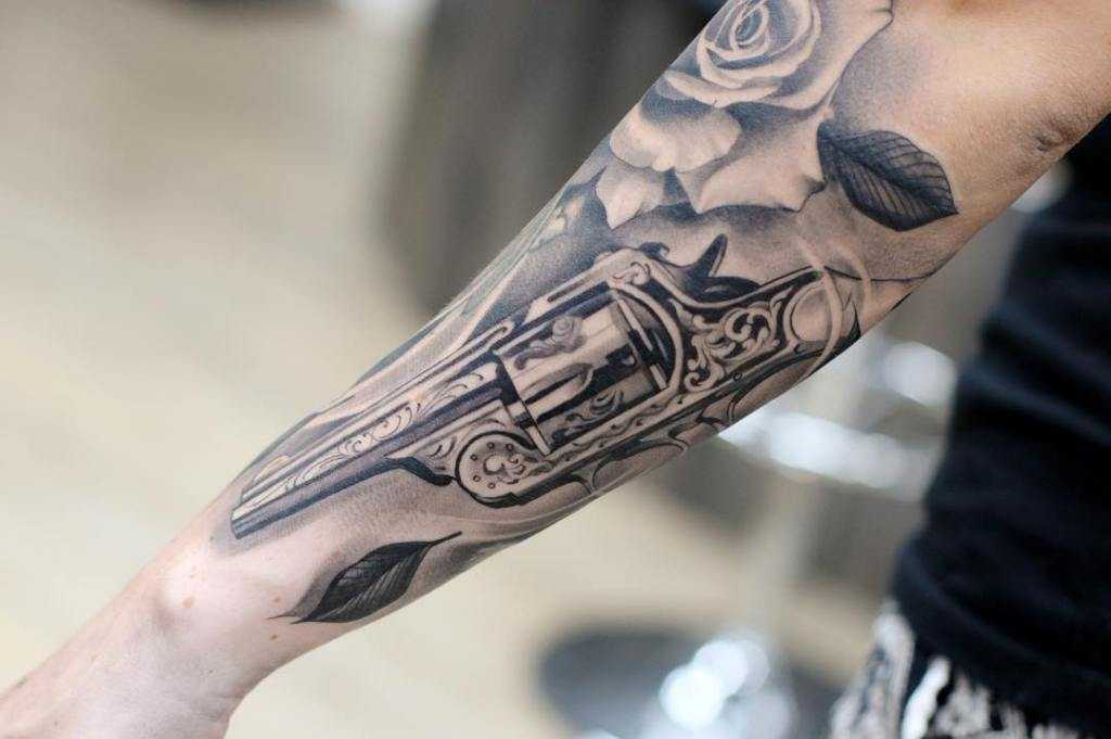 Любая татуировка должна соответствовать вашему имиджу и не навредить своей символикой. Нательные рисунки с пистолетом весьма разнообразны, что также означает наличие множества вариантов трактовок. Экспериментируйте и дополняйте выбранный вид оружия деталями на ваше усмотрение, которые максимально подчеркнут индивидуальность эскиза и помогут раскрыть вложенный в него смысл.