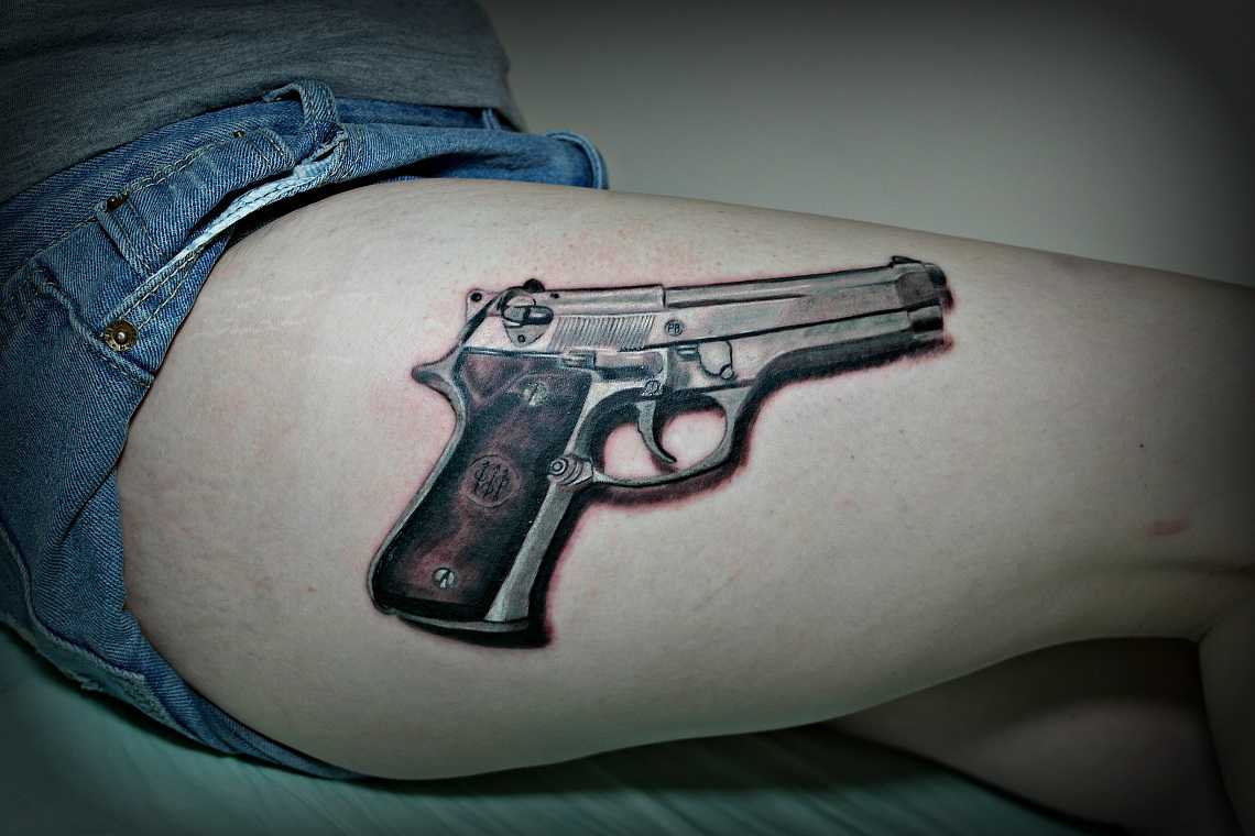 Наличие оружия наделяет человека определённой властью и вызывает опасение у окружающих, но, по мнению психологов, желание украсить своё тело подобными образами совсем не является отражением склонности своего хозяина к насилию и жестокости. Тату пистолет в большинстве случаев является демонстрацией умения достигать своей цели любыми способами или стремление защититься от агрессии внешнего мира на подсознательном уровне. Также подобные рисунки подчёркивают целеустремлённость, ведь пули, выпущенные из оружия, всегда попадают в цель, уверенность в себе и чёткие жизненные позиции, которых старается придерживается владелец тату.