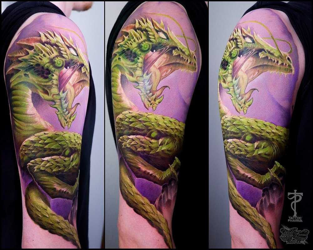 Лидером всех мифологических изображения является дракон. Эскизы с его образами поражают количеством вариантов и к основным значениям татуировки можно отнести благородство, великую мудрость, силу и красоту. Драконы всегда наделялись магическими способностями и умели выходить за грани возможного. В боди-арте их изображения редко разделяют на «добрых» и «злых». В большинстве эскизов они представляют силы природы, которые в свою очередь могут быть абсолютно разными.