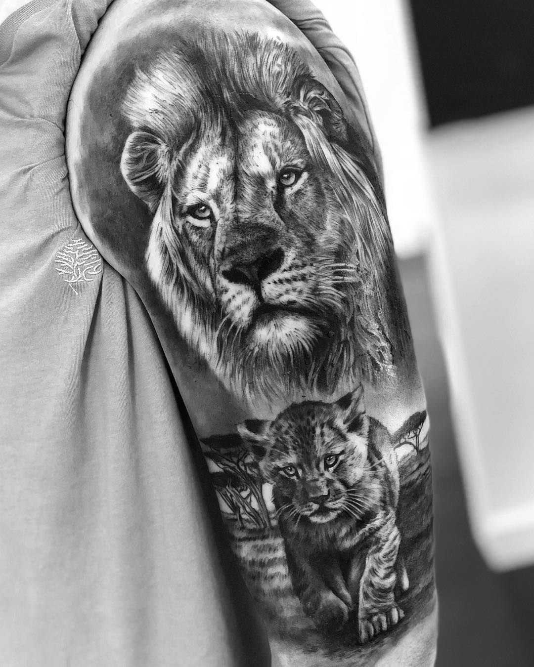 Рисунки со львом – царём зверей, отличаются наибольшей вариацией значений. Это древний и почитаемый символ, который часто встречается в вероисповеданиях многих народов. Символика татуировки основывается на львиных качествах, среди которых мудрость, величие, мощь, благородство, свирепость, власть и верность. Образ льва предпочитают наносить на своё тело особы, не подчиняющиеся никаким правилам и законам. Несмотря на это, их «царское» величие не приемлет лжи и ценит гармонию во всём.