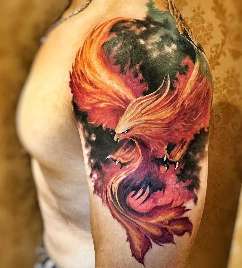 Татуировка с этой мистической птицей, способной вновь и вновь возрождаться из пепла, в современном мире воспринимается как оберег или талисман, способный не только защищать своего хозяина, но и максимально продлить его жизненный путь. Феникс считается символом бессмертия и обновления. Также, эта птица, наделяла богатством и везением людей, которым посчастливилось её отыскать. Наши предки ассоциировали Феникса с солнцем и связывали с ним огненную стихию. Основными значениями эскиза являются воскрешение, возрождение, огонь, солнечный свет, благородство, доброта и милость.