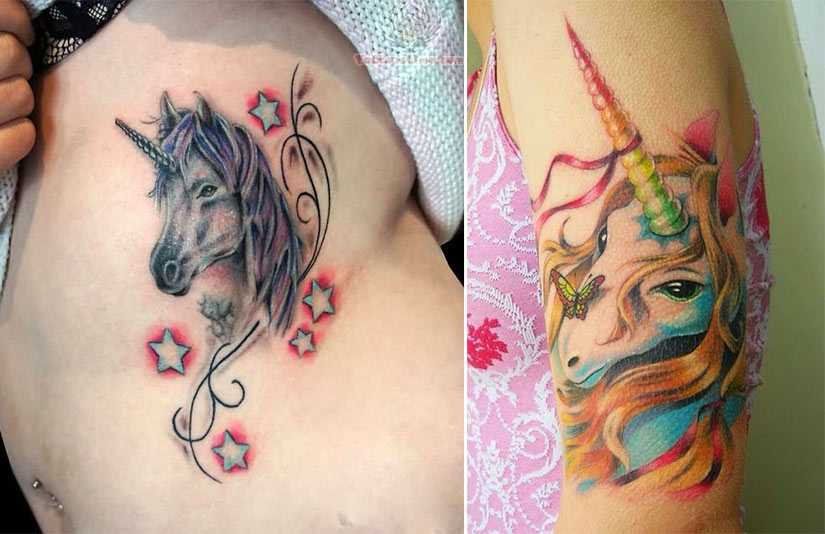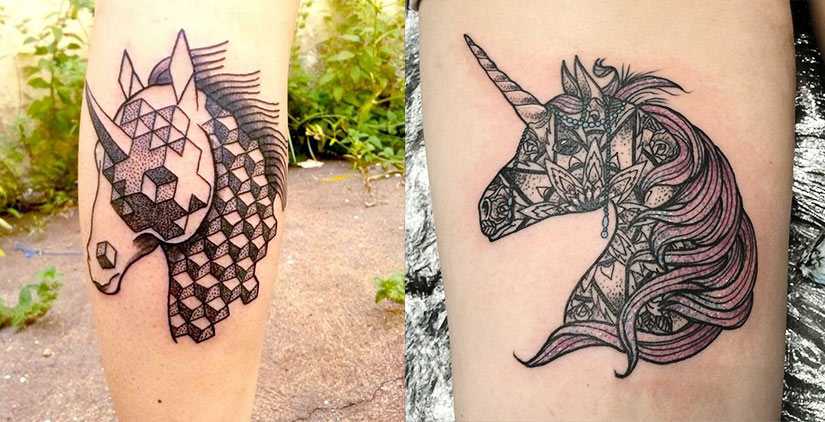 Если еще десяток лет назад 90% клиентов салона, заказывающих наколки с единорогом, были женского пола, то сейчас такого разрыва между полами нет. Разница лишь в выборе стиля оформления эскиза.