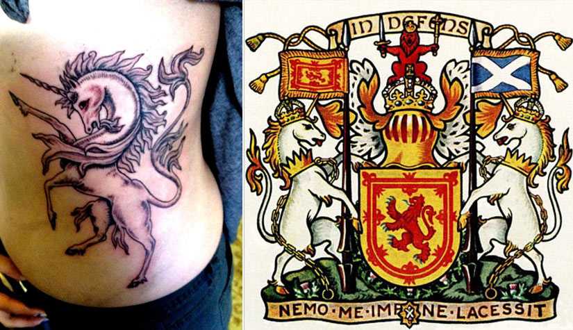 Наколка шотландского национального символа единорог, и рисунок герба с единорогами