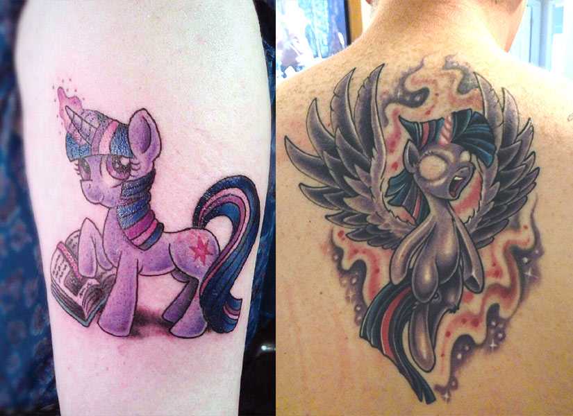 - Новая волна единорожьих татуировок была связана с выходом на экраны очередного поколения мультиков My Little Pony, в которых были не только единороги, но и пегасы, а также их гибрид – аликорны. Благодаря нестандартному подходу к сюжету, мультик понравился взрослой публике, в т.ч. мужчинам самых разных профессий.