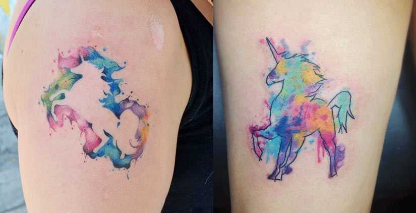 Интересный вариант исполнения тату с единорогом – белый контур, созданный внутри цветного акварельного фона. Также популярны схематические и минималистические изображения.
