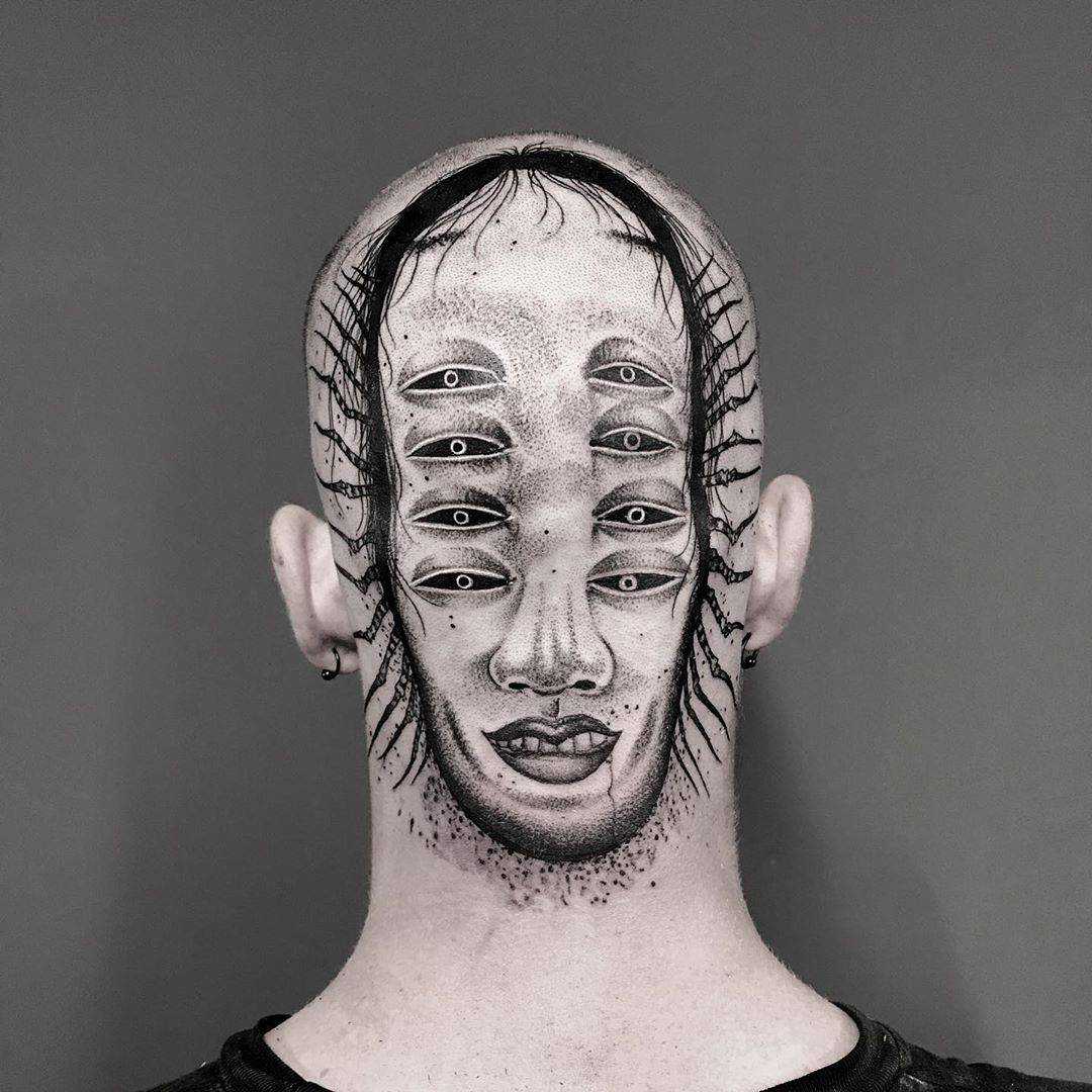 - Татуировка на шее, изображающая сову с раскрытыми крыльями;