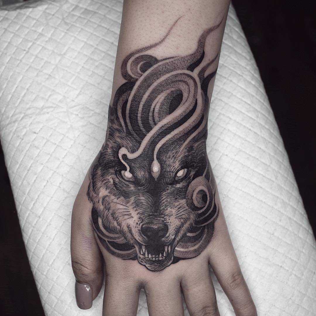 Голова волка, вытатуированная на указательном пальце женщины, свидетельствует о ней, как о женщине лидере, умеющей постоять за себя и возможно ведущая за собой коллектив.