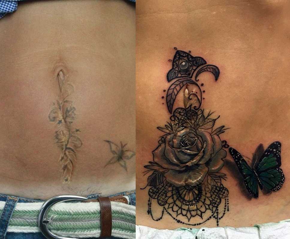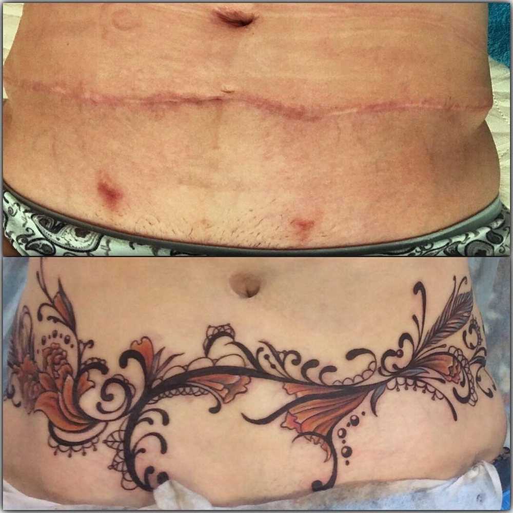 Любая женщина, которая готовится стать мамой, может столкнуться с таким оперативным вмешательством, как родоразрешение путём кесарева сечения. После данной процедуры остаётся шрам в нижней части живота, который в большинстве случаев создаёт дискомфорт и вызывает стеснение. Для тех, кто решается исправить этот дефект путём нанесения татуировки, мастера предлагают большой выбор эскизов, которые помогут «замаскировать» эту проблему. В основном женщины предпочитают изысканные цветочные узоры с переплетениями, либо другие тематические рисунки или ажурные надписи. Стоит только отметить, что татуировки на таких шрамах выглядят красиво лишь на подтянутых мышцах, поэтому следует хорошо взвесить все плюсы и минусы перед выполнением этой процедуры.