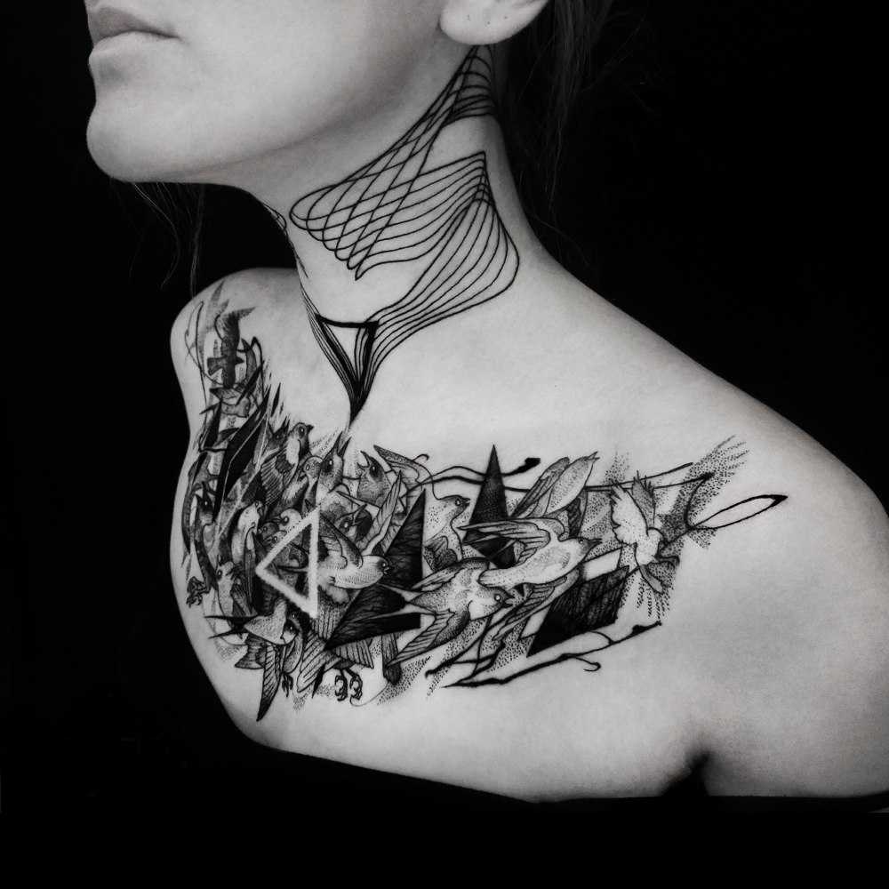 Тату, находящееся ниже на шее, значит, что человек наделен уникальными или редкими качествами и он желает это продемонстрировать. При этом он довольно напряжен, считая, что неспособен справляться с текущими событиями.