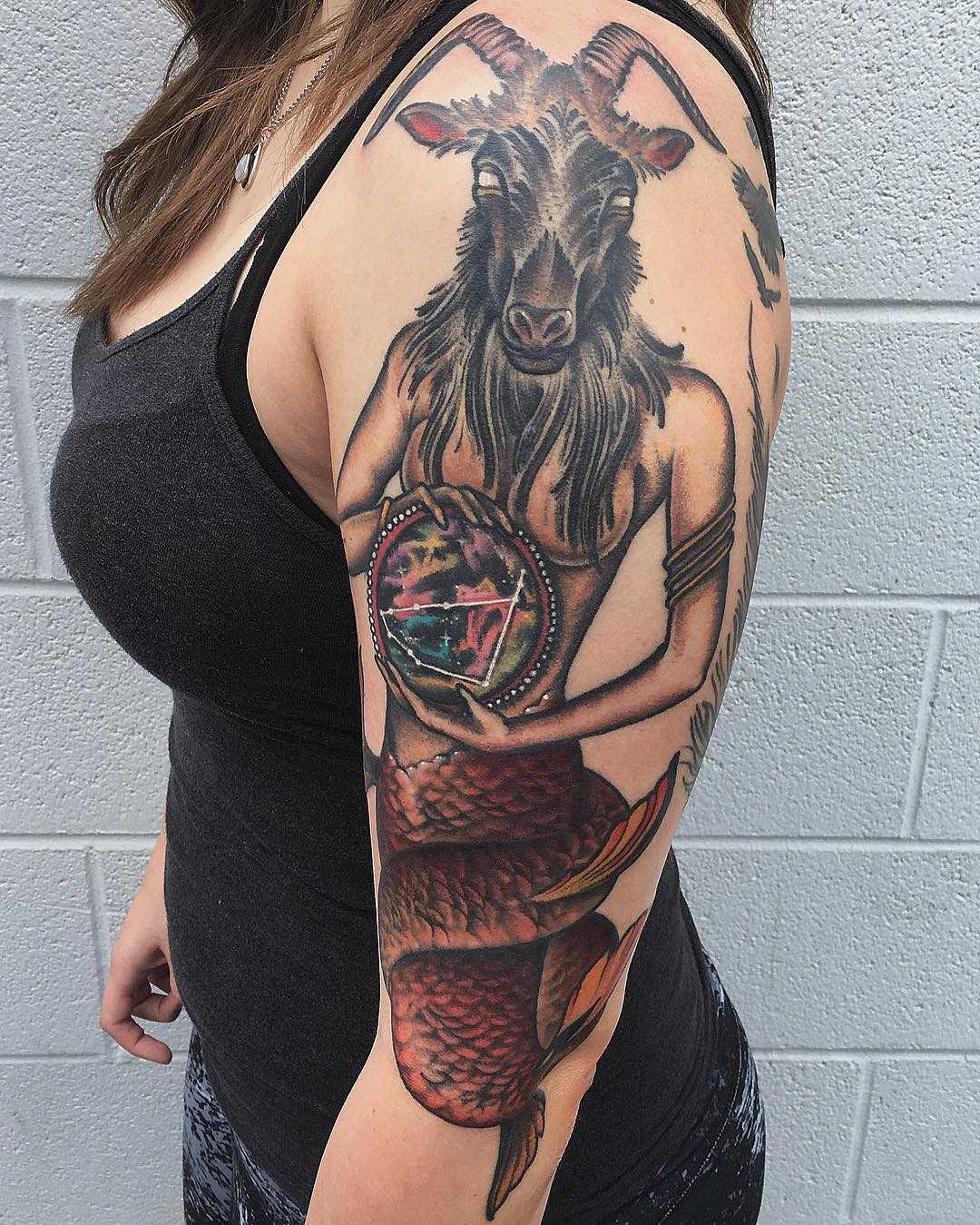 Любые дополнения в походной и морской тематике понравятся Козерогам-путешественникам. Черепа, песочные или старинные часы подчеркнут философское отношение владельца тату к смерти. Изображения подков, карт или монет притягивают удачу и везение. Разнообразные геометрические или алхимические фигуры символизируют о симпатии обладателя тату ко всему мистическому и потустороннему. Всевозможные элементы флористики свойственны особам, любящим природу.