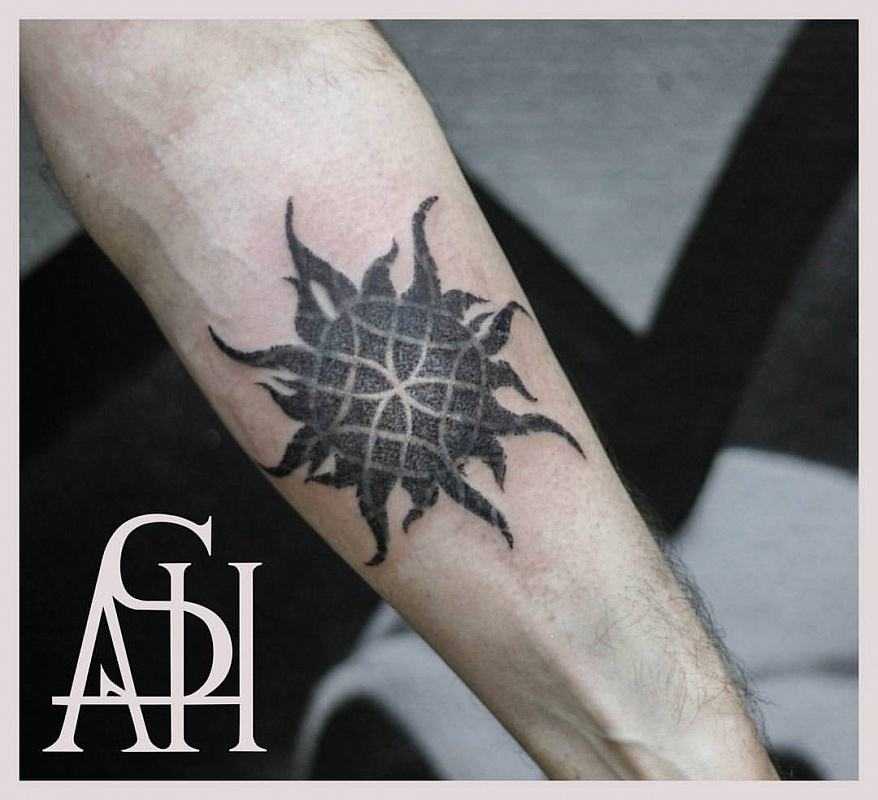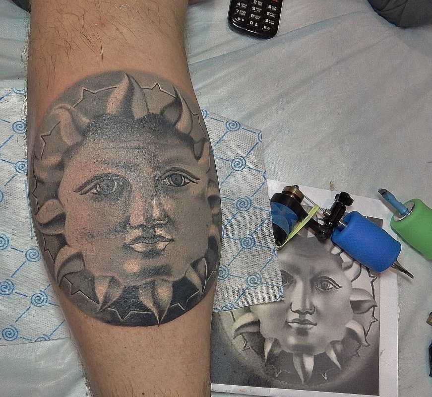 Сегодня большой популярностью пользуется эскиз тату черного солнца. Такую татуировку используют те, кто желает расширить свои мистические грани познания. Обычный славянский эскиз солнца (в простонародье «Солнцеворот») также пользуется большой популярностью и имеет огромное количество вариаций. Многие изображают солнце в комбинации со свастикой. Но сразу хотим отметить, что это не имеет ничего общего с фашизмом. Такое изображение обозначает древнеславянский знак Бога Солнца. Популярной сегодня является татуировка солнца в компании луны. Оригинальный вариант – когда в эскизе солнце частично перекрыто луной.