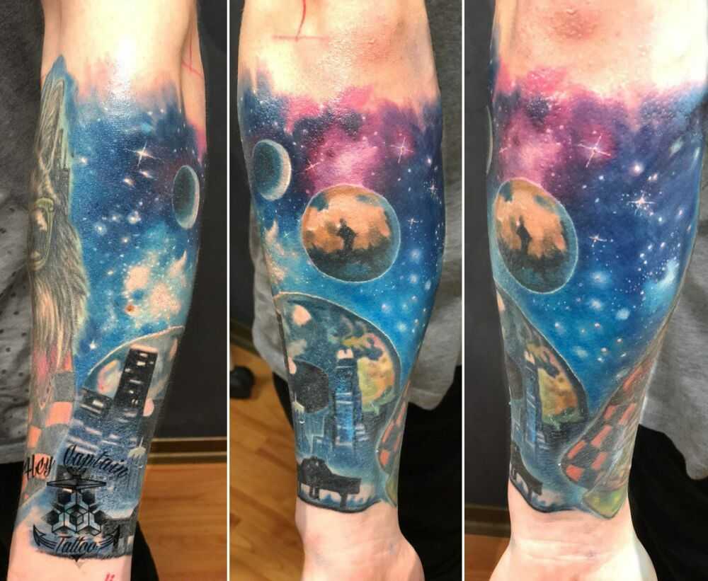 • фантастические тату на тему космос, на которых просторы Вселенной бороздят космические корабли, выдают любителя фантастики. Они также говорят о том, что человек смотрит в будущее, принимает прогресс и стремиться ко всему новому;