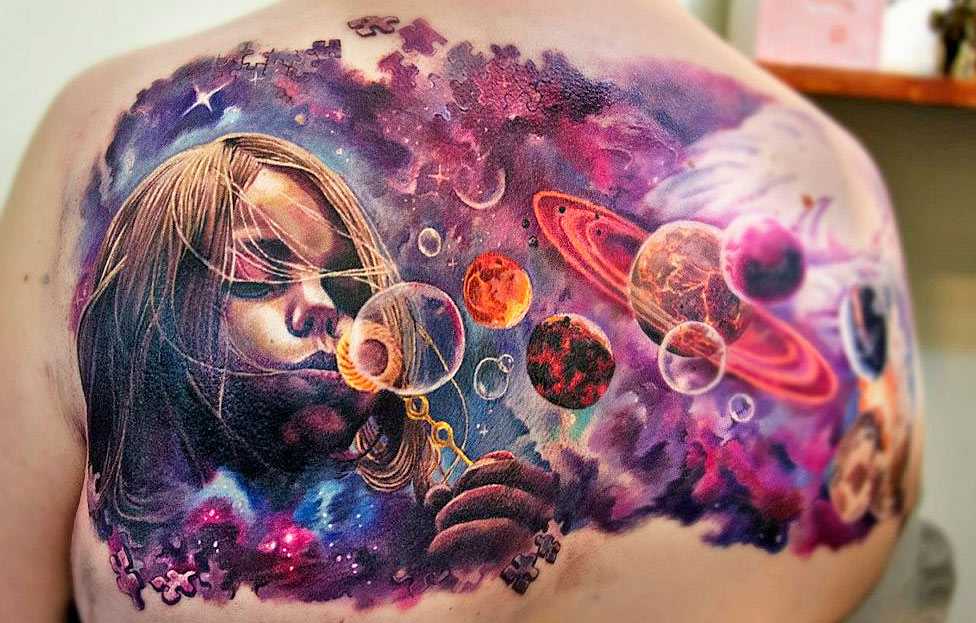 Зона идеально подходит для масштабных сюжетов, позволяя опытному татуировщику создать неповторимую аналогию объемного космоса. На этой части тела можно набить сложные рисунки с изображением Солнечной системы и детальной прорисовкой всех девяти планет.