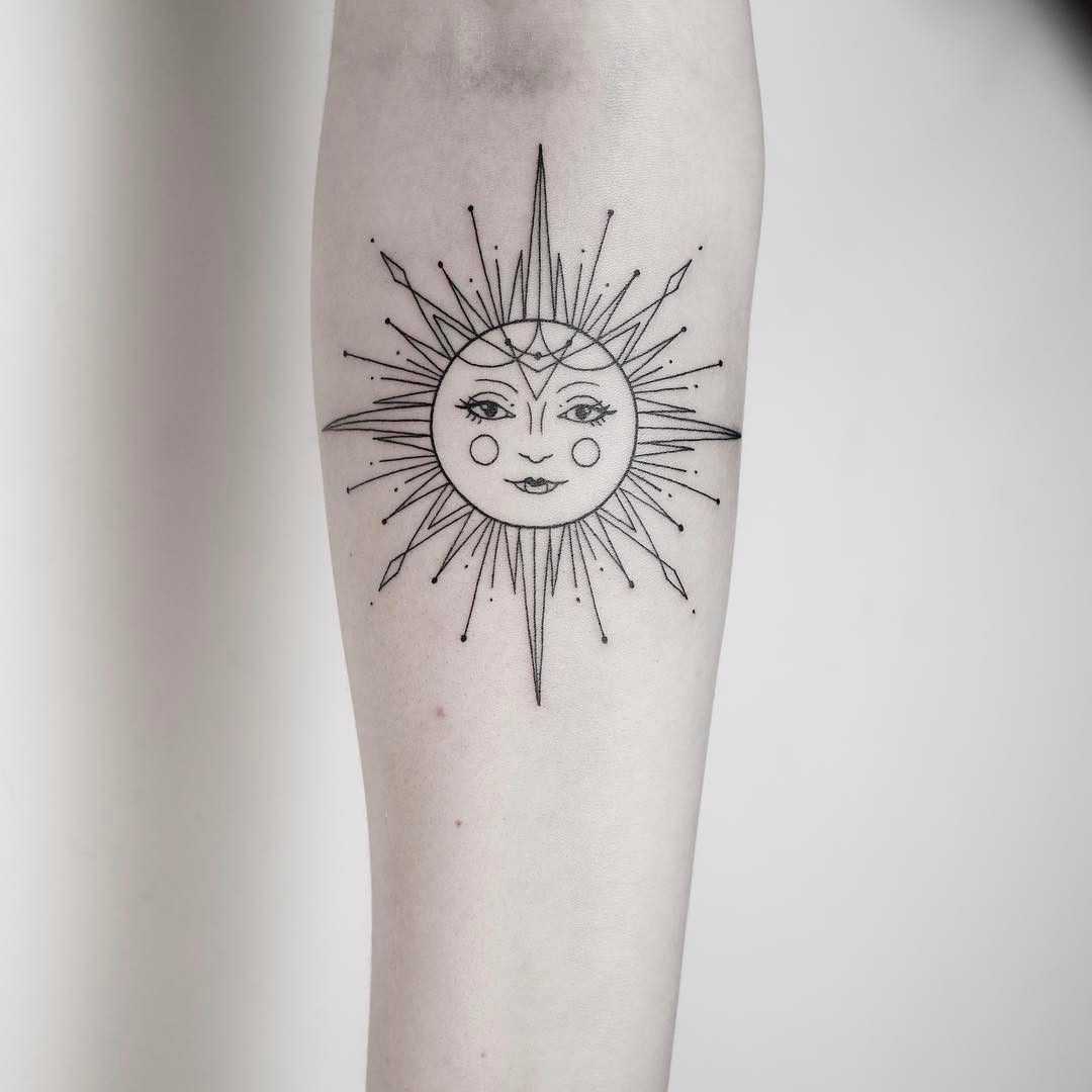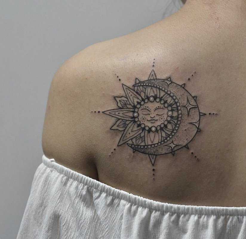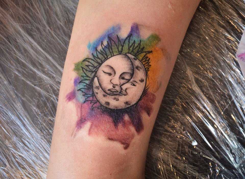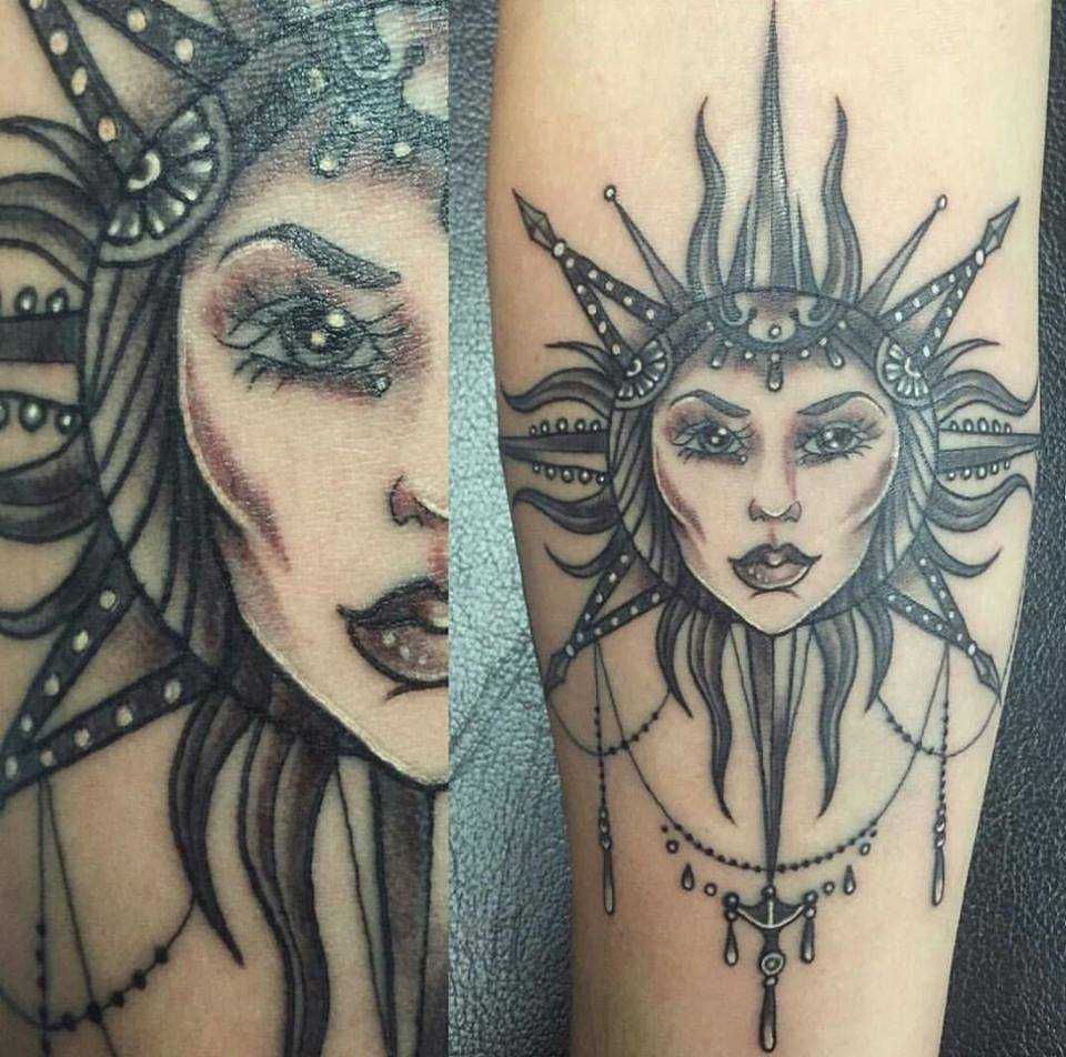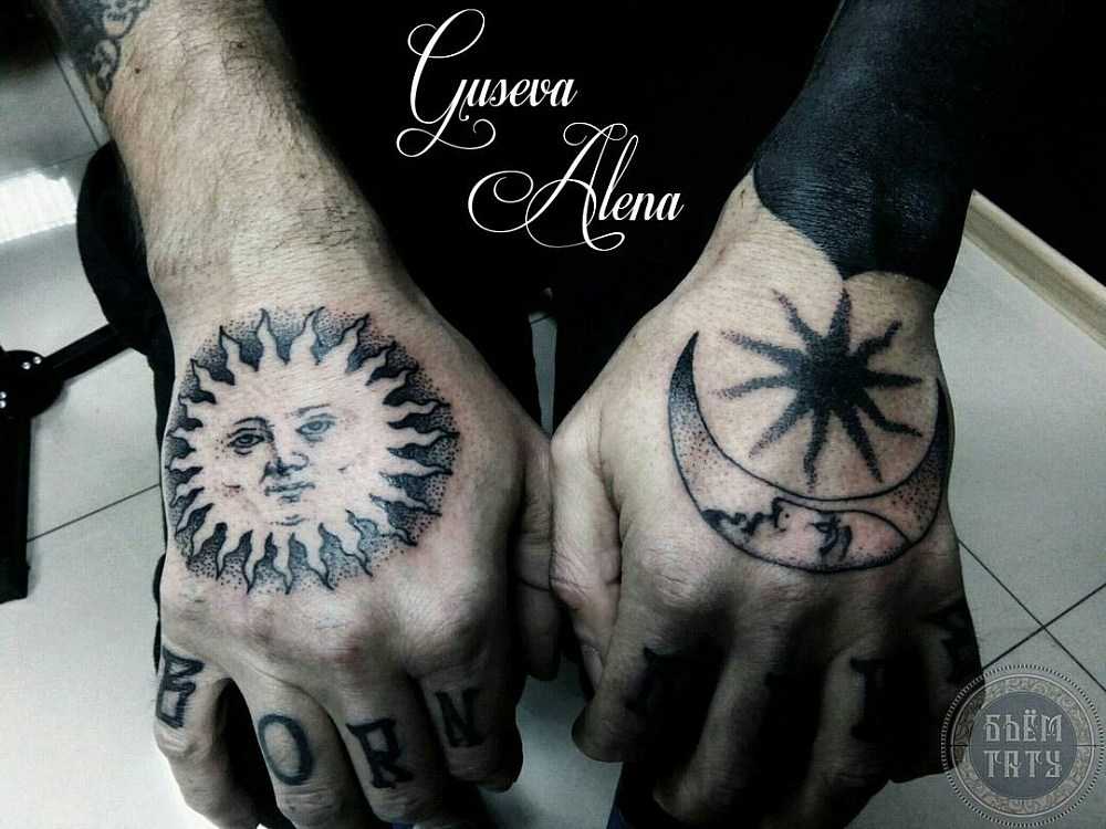 • тату солнце и луна – на изображении могут находиться рядом, сливаться образуя некий символ или располагаться на разных руках. В любом случае значение – это единство двух противоположностей, дня и ночи, света и тени, тепла и холода, добра и зла, мужской и женской энергии. Своеобразная интерпретация восточного символа Инь-Ян;
