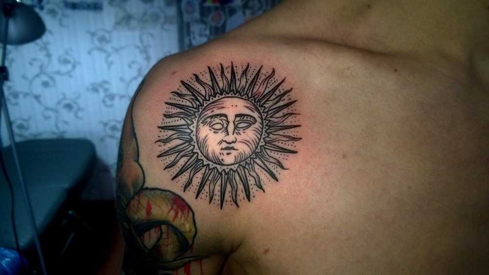 Татуировка с изображением солнца несет позитивную энергетику. Поэтому вы никогда не пожалеете о выборе данного рисунка для украшения своего тела. Помимо того, что такая татуировка имеет только положительное значение, она еще и смотрится очень оригинально.