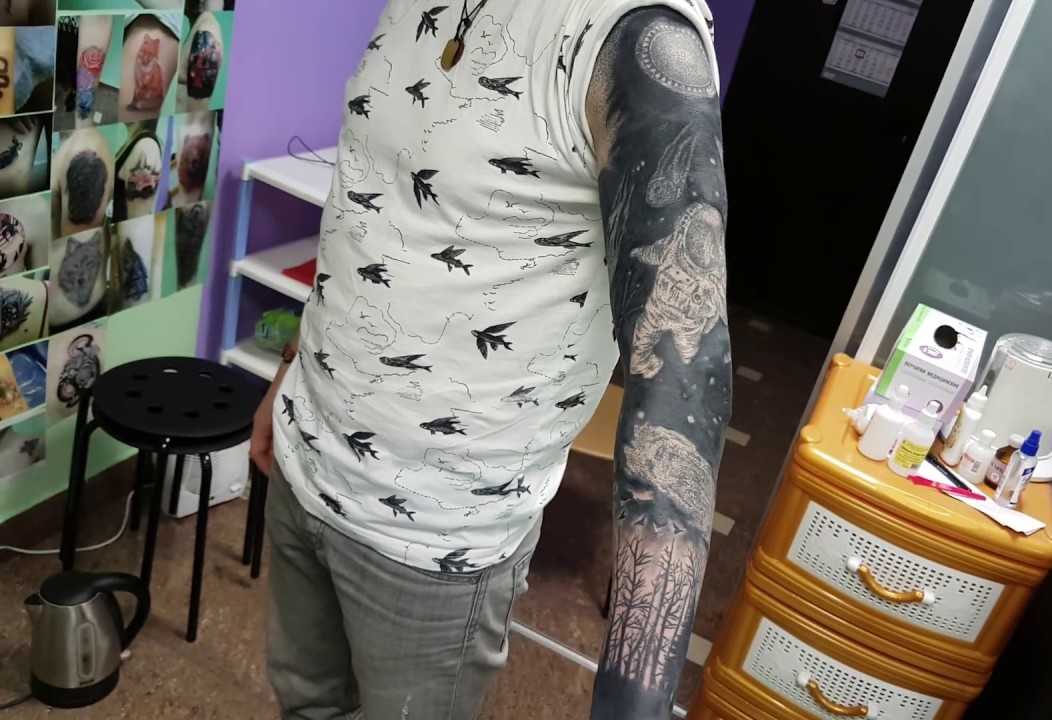 Вариант рукава всегда востребован, поскольку эта область позволяет отпустить фантазию для создания масштабного панно на тему звездных просторов космоса. Для наиболее отважных ценителей нательной росписи у мастеров имеются эскизы полного рукава, когда сюжет стартует с головки руки, струиться по плечу и предплечью, заканчиваясь на запястье.