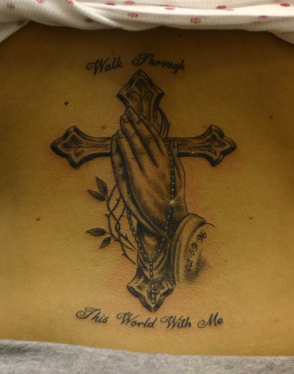 Молитва тату выполняемая как шрифтом, так и изображением. Это особенность религиозного направления в татуировке. Характерным примером является тату руки молящегося с крестом. Она позволяет сделать выводы, что человек несет смирение в душе и прославляет своего Бога.