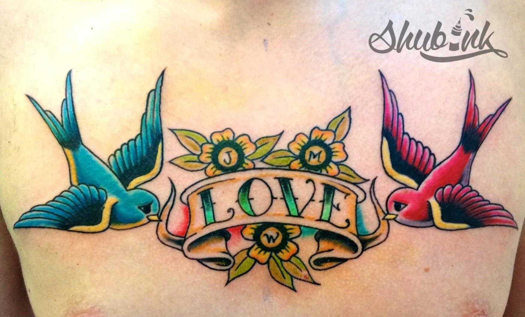 Область груди всегда отвечает за душевные переживания и дела сердечные. А если это татуировка с ласточками, она говорит о мечтах свободного мужчины создать семью, семейного – сохранить брак и крепкую любовь.