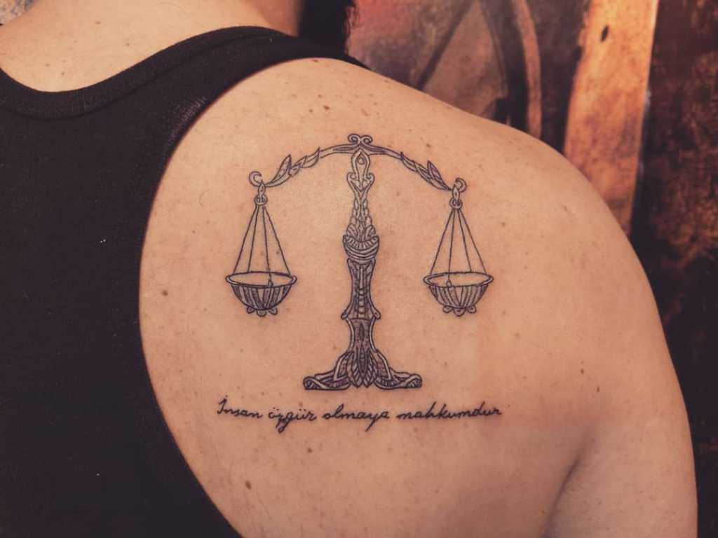 На спине, как правило, в области лопаток, чаще всего изображаются весы, либо же девушка, которая держит их в руках. Как правило, эта область для наколок наиболее востребована у мужчин.