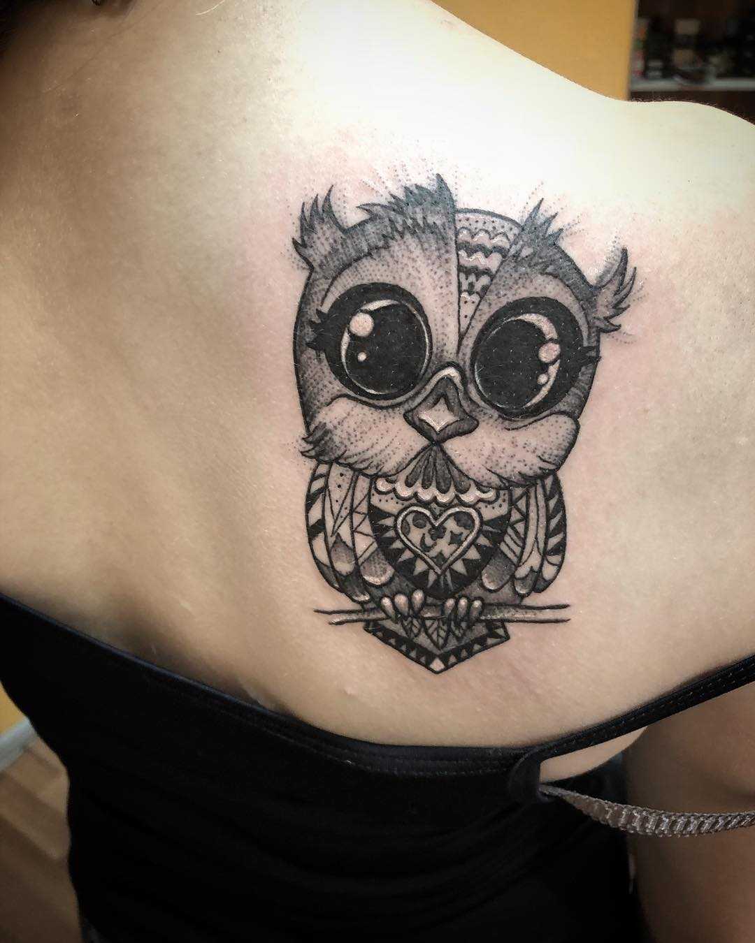 При этом желательно выбирать большие рисунки, расположенные на груди или спине. Идеальный вариант для хорошо физически развитых мужчин – монохромная татуировка с изображением филина на икрах. Не менее привлекательно смотрится птица в стиле дотворк или гравюра, отличающихся лаконичностью и четкостью линий.