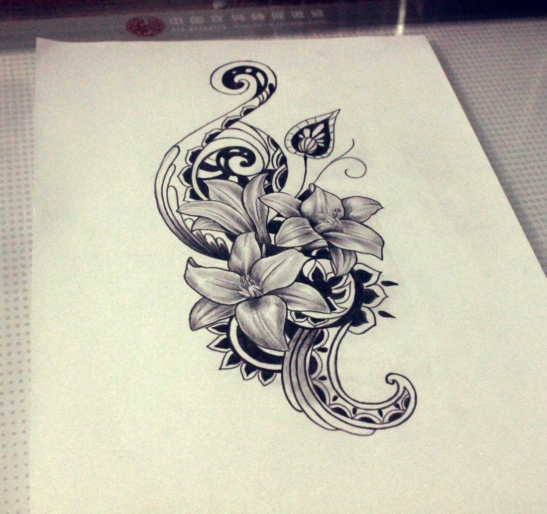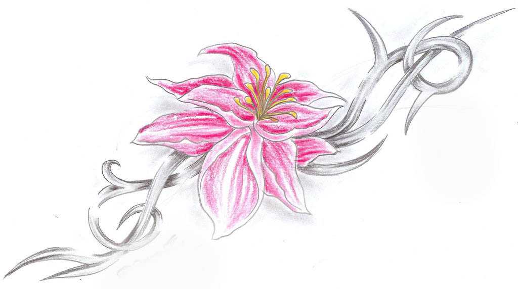 Среди эскизов стоит отметить также эскиз, где лилия изображена с одним или двумя мечами – символ мужества и благородства, верности своим принципам. Не менее интересно выглядят композиции, дополненные другими цветами, создающими букет. Что касается расположения рисунка на теле, то популярны следующие варианты: