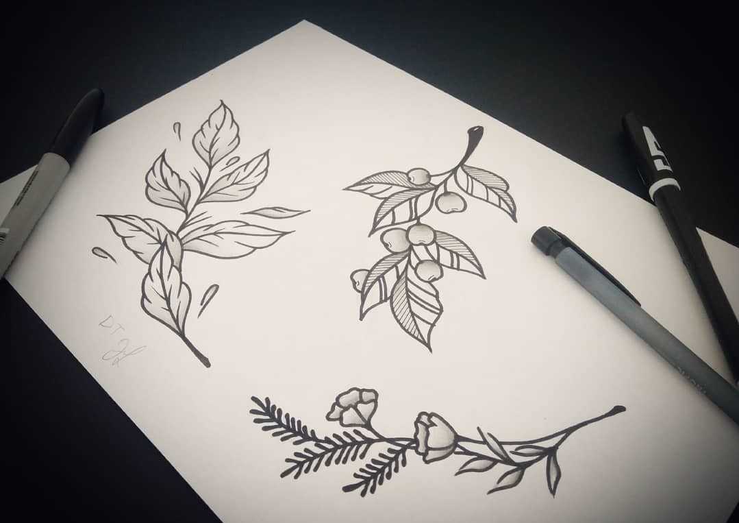 Олд-скул. Зачастую ветка выступает в роли дополнительного элемента к основному рисунку, например, используется в качестве рамки. Также ветка может быть самостоятельным предметом или же дополняется черепами, птицами и лентами с надписями.