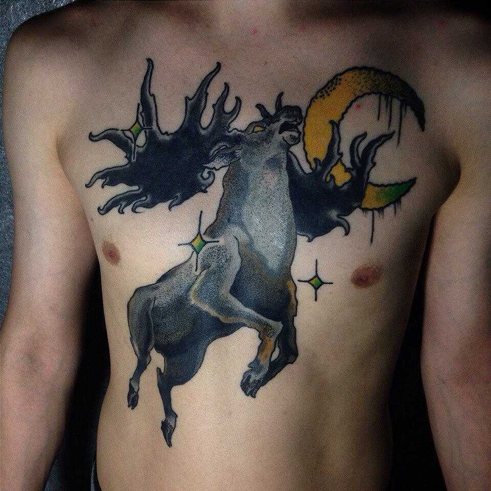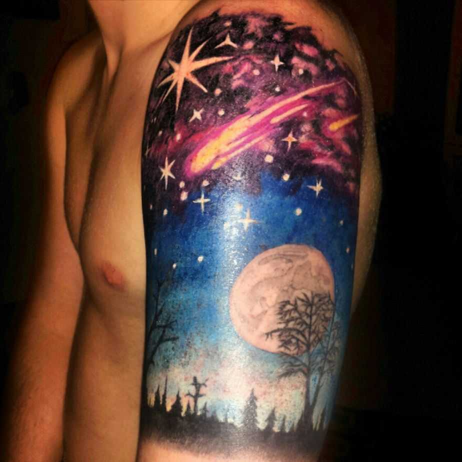 Расположение татуировки зависит от размера рисунка. Большие по размеру, тату в виде полумесяца, окружённого звездами или волк, сидящий под половиной луны. Такие рисунки отлично смотрятся на спине между лопатками, на бедре или животе.