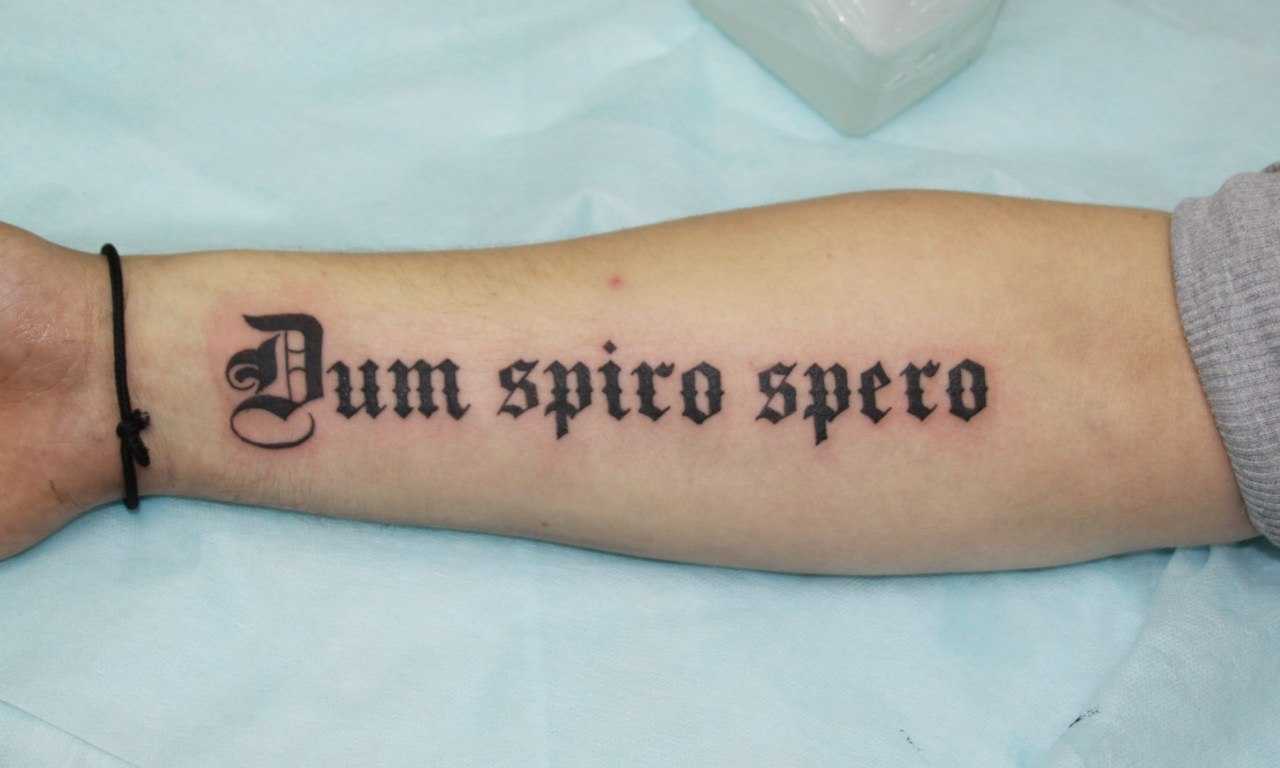 Надписи, выполненные на латыни – это прекрасный способ нанести на свое тело фразу, наполненную глубоким философским смыслом и подходит для интеллектуально развитых людей, задумывающихся о бытие, жизни и ее смысле. Каждая фраза, написанная на латыни, имеет особое значение и глубокий смысл, который зачастую понимает лишь собственник татуировки. Латынь помогает скрыть от окружающих свое жизненное кредо и сакральные мысли, ведь далеко не каждый может понять надпись, выполненную на мертвом языке.
