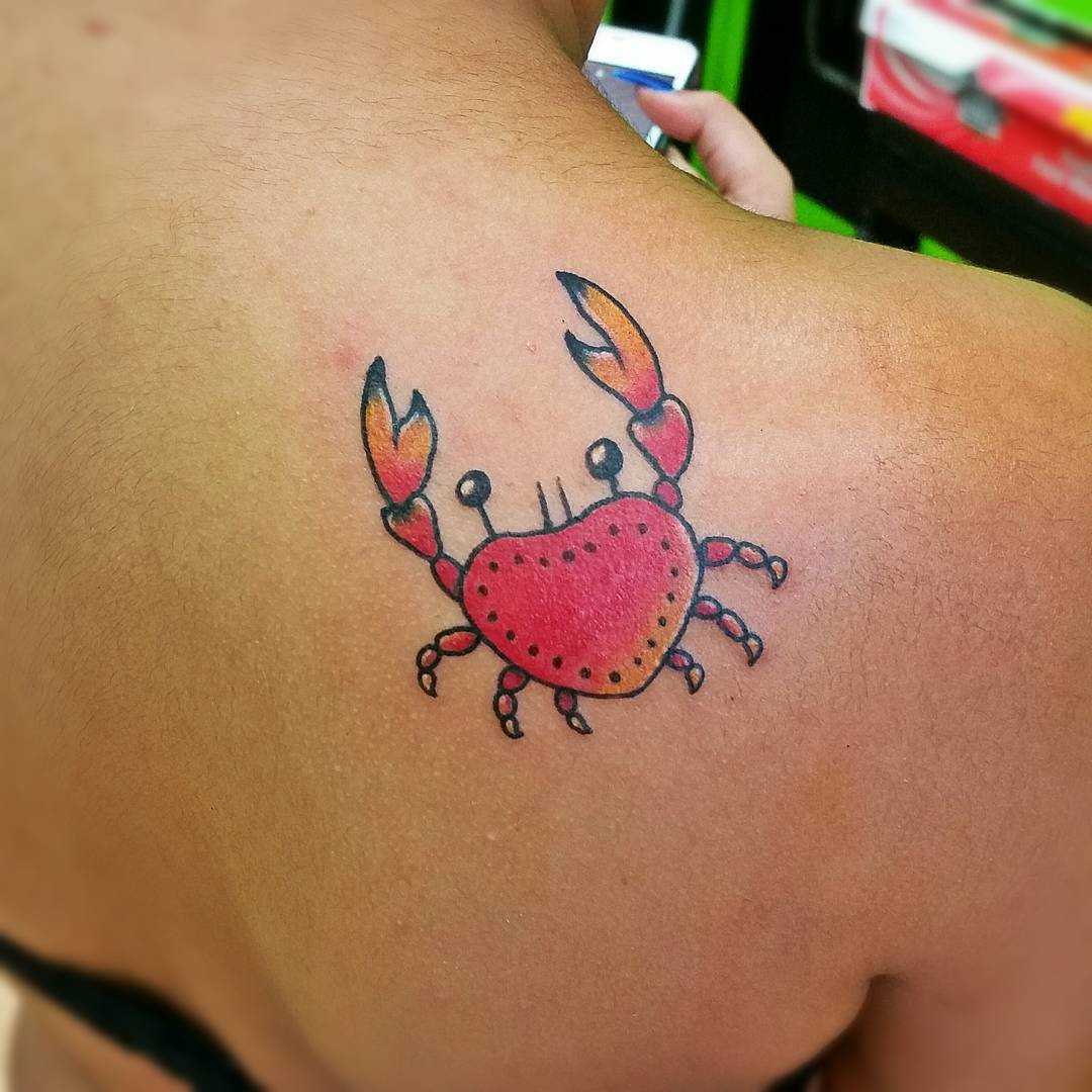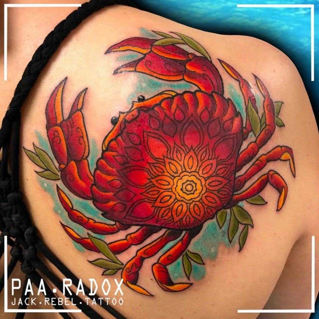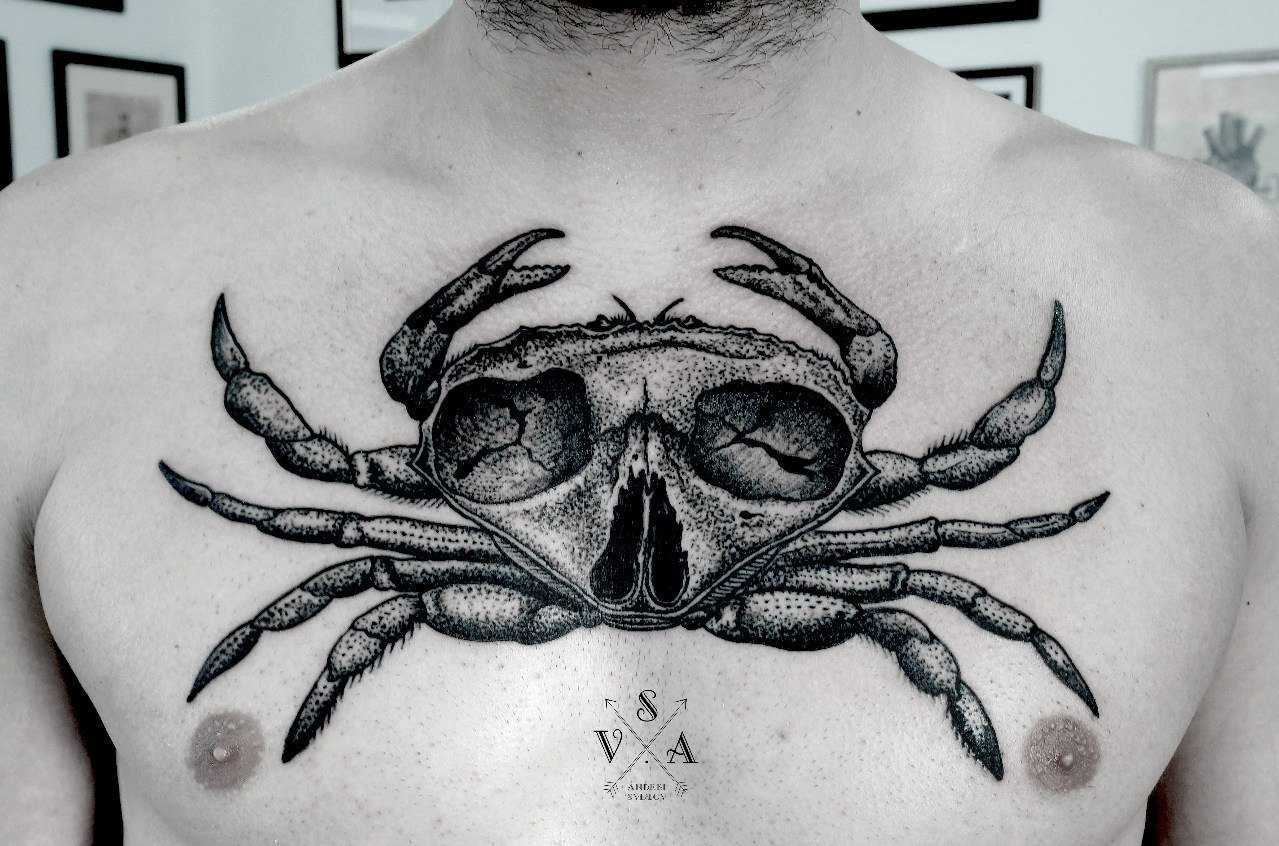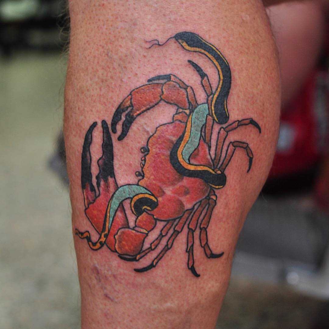 Татуировка в виде Рака на мужском теле часто изображают в технике реализм. Такие тату смотрятся ярко и заметно, полностью передают смысл тату. Считается, что яркие татуировки на теле способны привлечь в жизнь своего обладателя удачу, обострить интуицию и ясность ума.