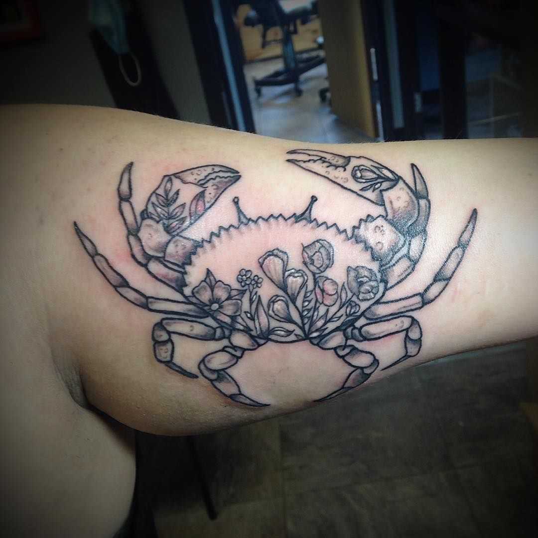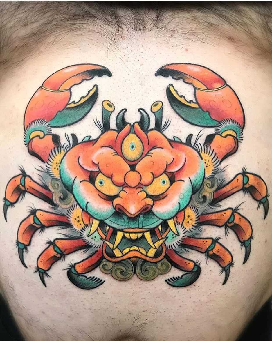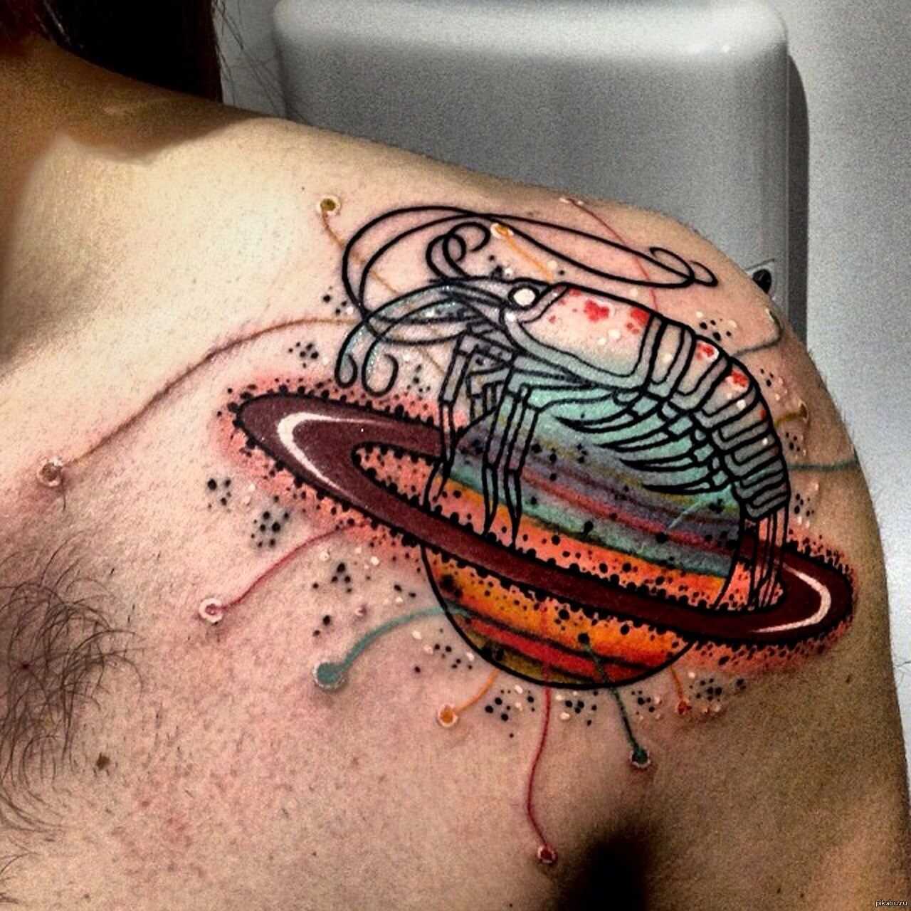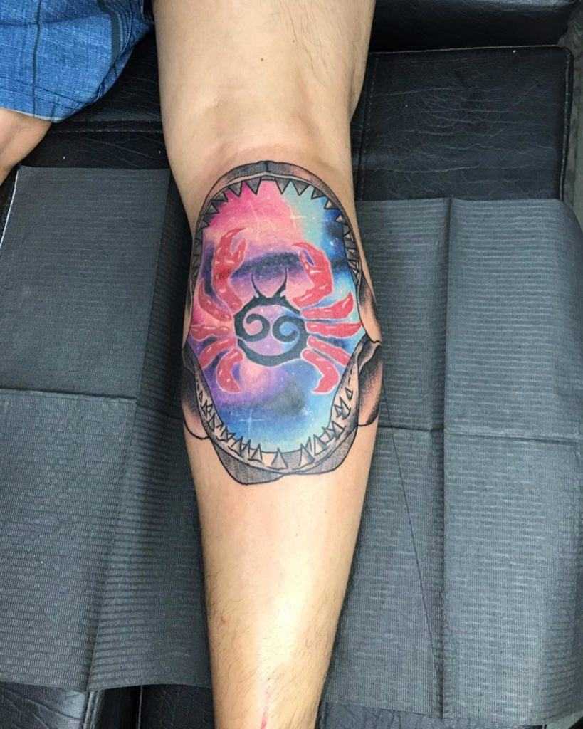 Татуировка в виде Рака на мужском теле часто изображают в технике реализм. Такие тату смотрятся ярко и заметно, полностью передают смысл тату. Считается, что яркие татуировки на теле способны привлечь в жизнь своего обладателя удачу, обострить интуицию и ясность ума.