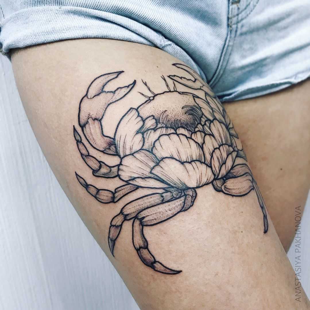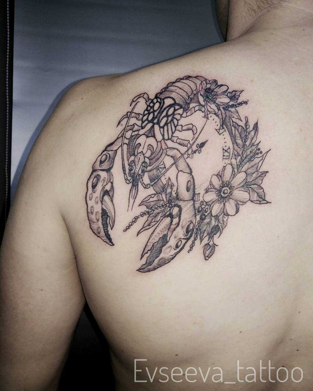 На мужском теле эффектно смотрятся тату, выполненные на внешней стороне плеча, на спине, на шее. Интересно смотрится тату на бедре. Рак, выполненный на спине создает ощущение крепкой спины. Такое тату будет служить своеобразной поддержкой для мужчины. Нередко тату Рак располагают на груди, на подъему стопы, с внутренней стороны бицепса.