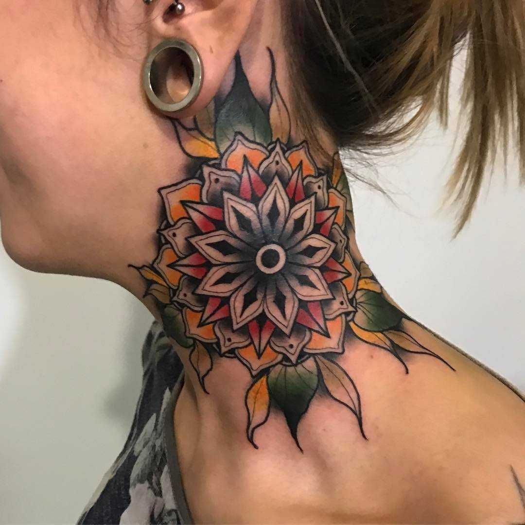 Цветное тату на шее – отдельная тема в тату-искусстве. Это показатель романтичности девушки. Татуировка добавляет образу кокетства и привлекает взгляды мужчин. Рекомендуется использовать маленькие, но яркие рисунки, которые будут обязательно замечены.