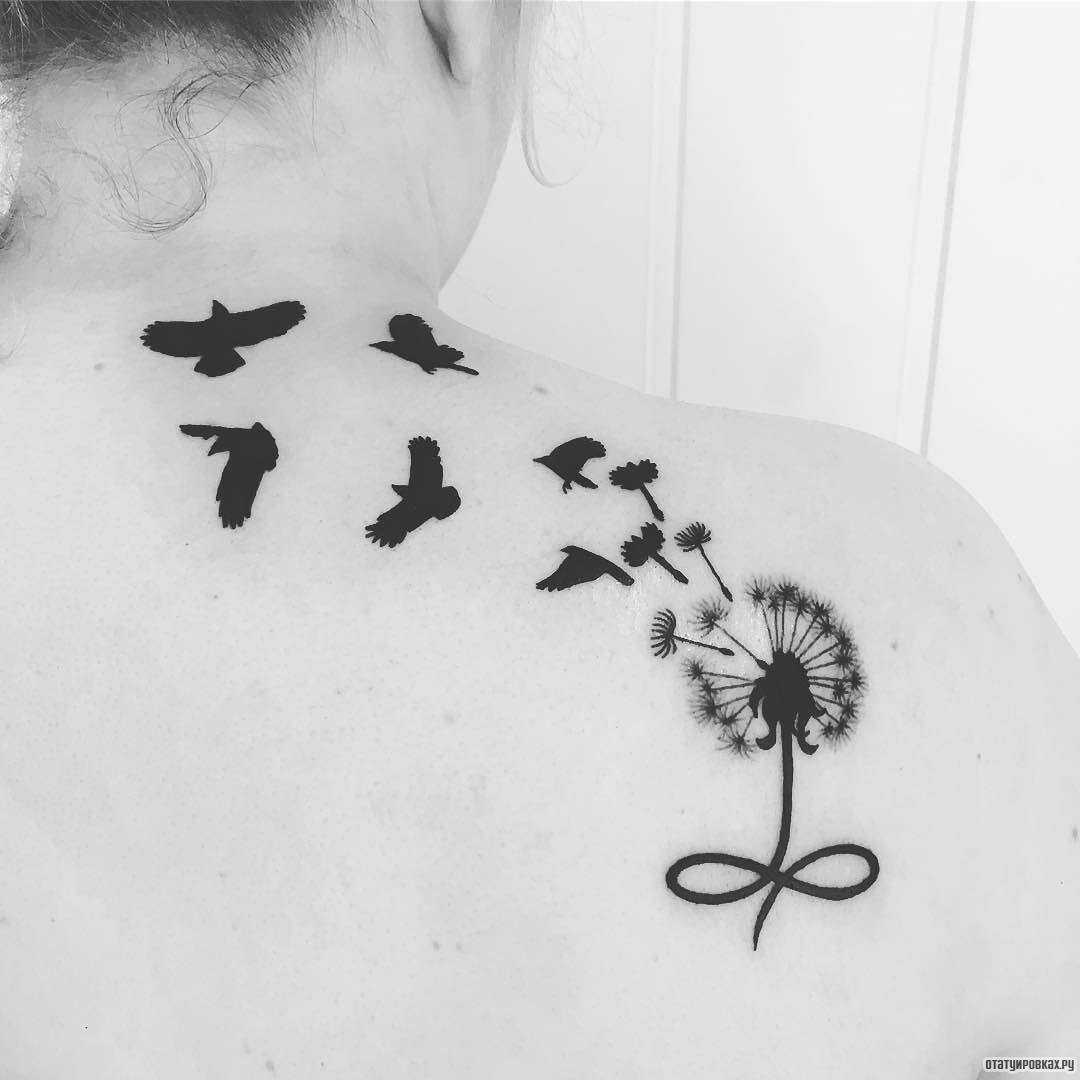 Очень эффектно будут смотреться на девушках большие татуировки птиц с распростёртыми крыльями. Вы можете также выбрать яркую Жар-птицу, ласточек, сов, либо других птичек.