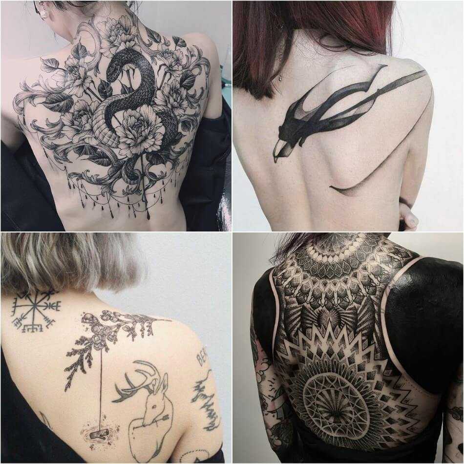 На всю спину женщины наносится реалистичное изображение животного, птицы с развернутыми крыльями. Профессиональные мастера сотворят живописное чудо. Спину забивают цветочным и геометрическим орнаментом, линиями с границами, необыкновенными фигурами. Все элементы сливаются в единый образ.