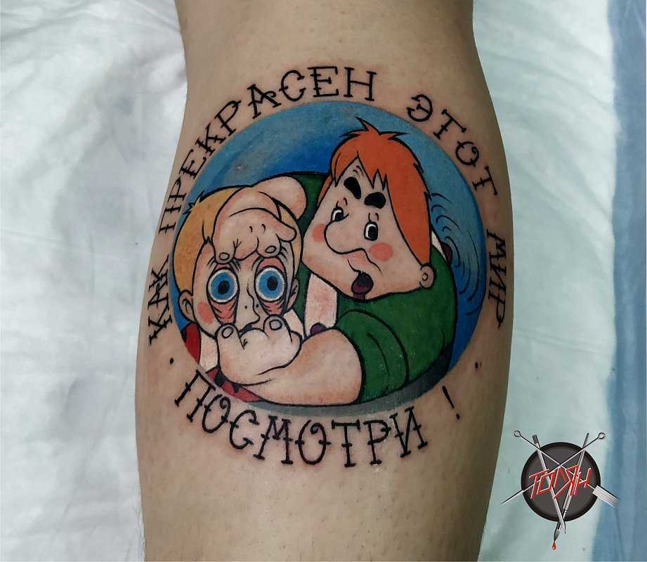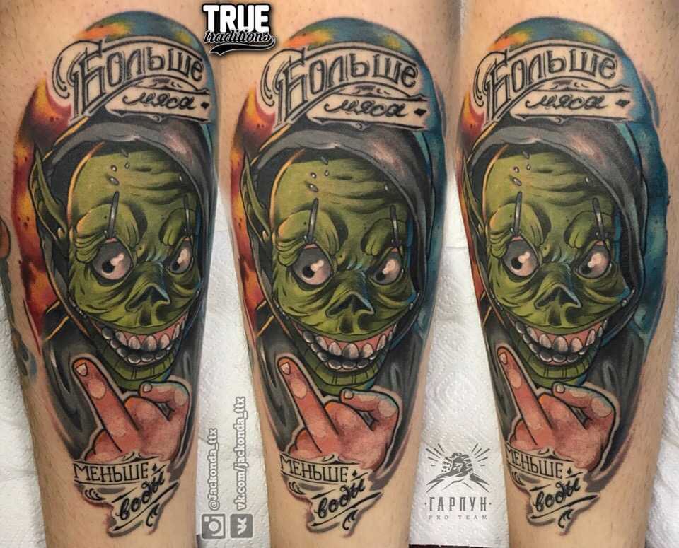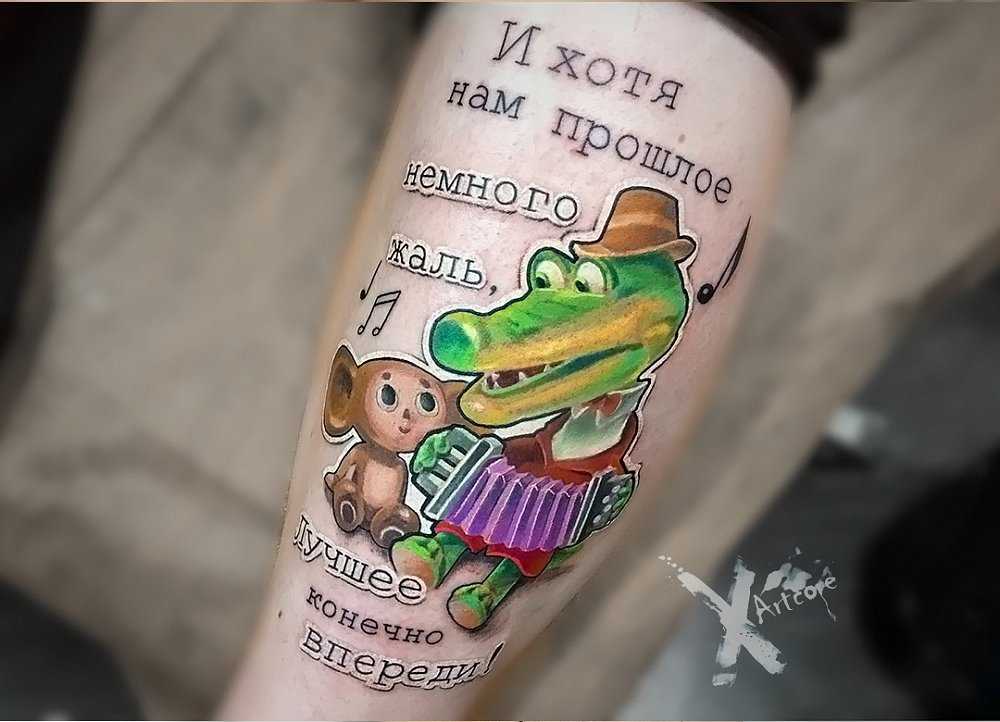 - Граффити. Это уличное искусство довольно быстро добралось и до тату-культуры. Основная идея в совмещении надписи и рисунка.