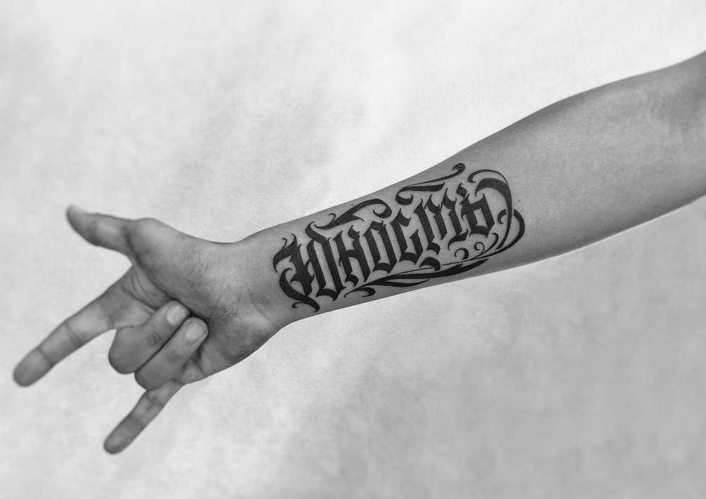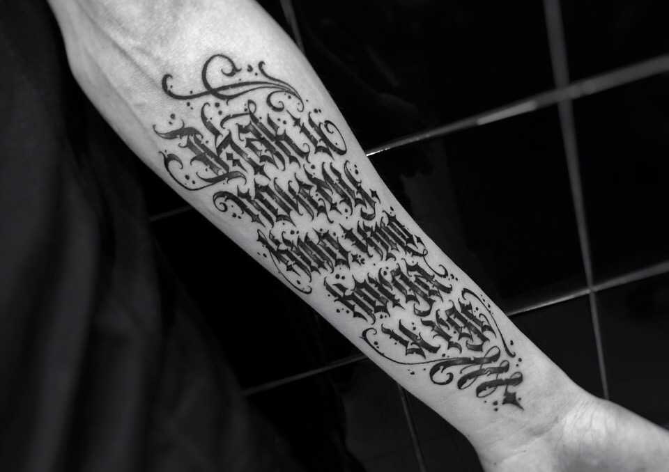 - Готический. Выглядит, как средневековые письмена. Иногда, прочитать текст в таком исполнении очень сложно. Изображается обычно в черно-белых цветах и смотрится мрачновато, так что больше подходит для мужчин.