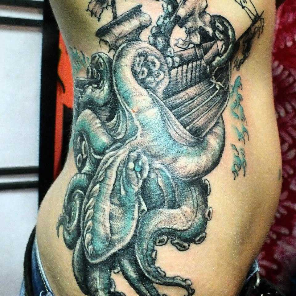 В средние века существовало далеко не одно значение тату осьминога. Люди считали его покровителем морской пучины и закономерно боялись. В те времена они верили в Кракена и прочих чудищ. Впрочем, открытие учёными существования на глубине гигантских осьминогов и кальмаров говорит о том, что боялись наши предки не зря.