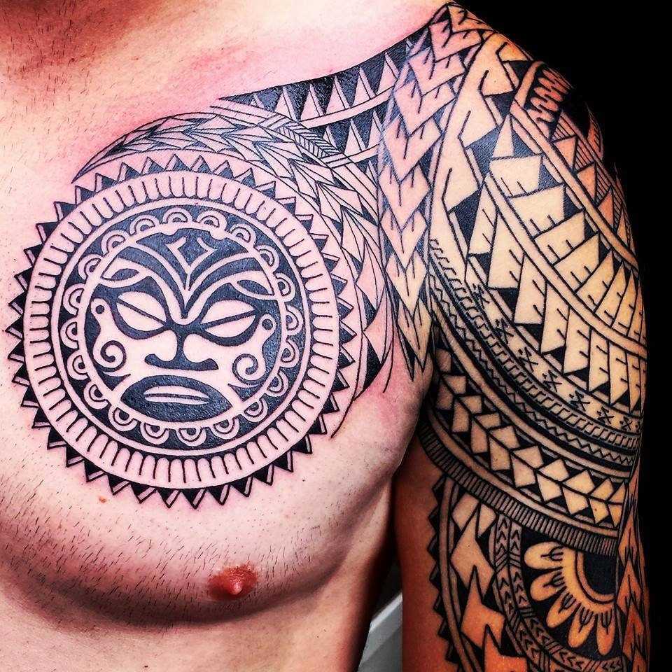 - Полинезия или трайбл – также один из мужских вариантов наколок с изображением оригинальных и ярких рисунков. Особенность – для создания изображения используют линии, точки и узоры, начертания и прочие геометрические детали.