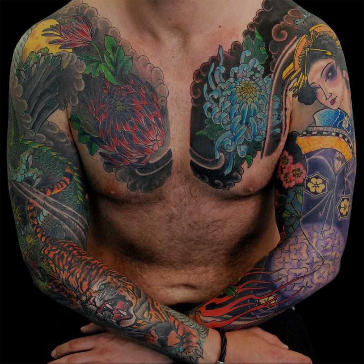 - Иредзуми – наколки, которые впервые появились на телах участков клана якудза. Обычно рисунки занимают все тело, начиная от ног и до шеи.