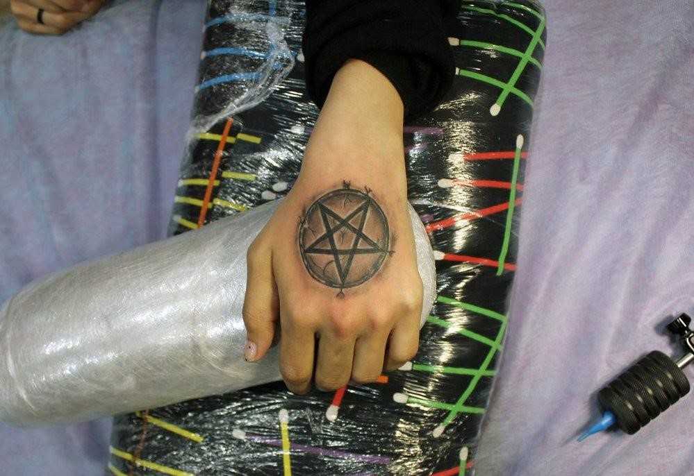 Среди тех, кто не связан с магией, популярен вариант тату пентаграмма на запястье. Миниатюрное изображение смотрится максимально органично, стильно и не броско.
