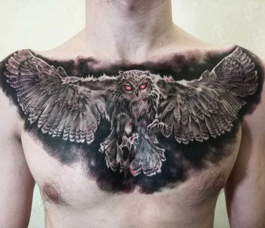 Нередко, татуировка с совой наносится на всю грудь, позволяя детально изобразить ее красивые и мощные крылья.