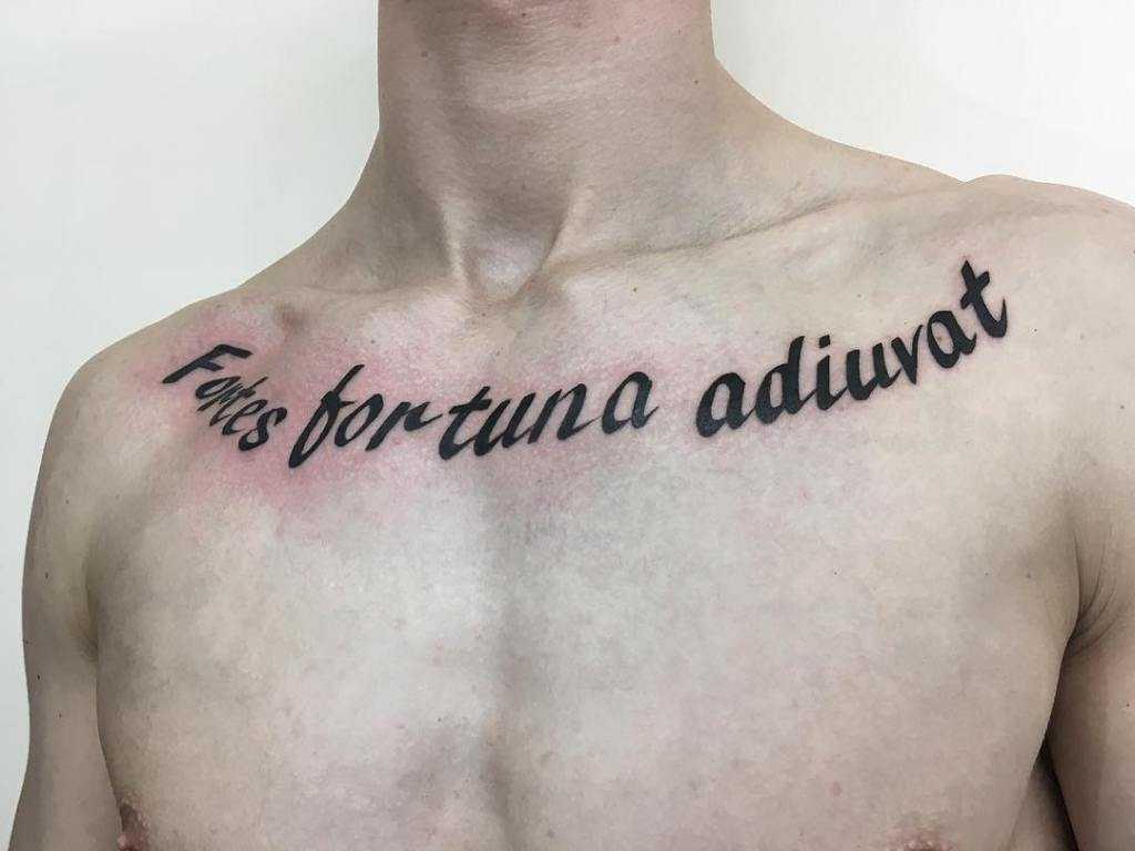 Классная идея, которая отлично смотрится на груди – татуировка в виде надписи. На любимом языке можно нанести цитату или фразу из любимого произведения, фильма, книги или песни. Чаще всего, многие парни выбирают для надписи на груди английский, арабский или латинский язык.