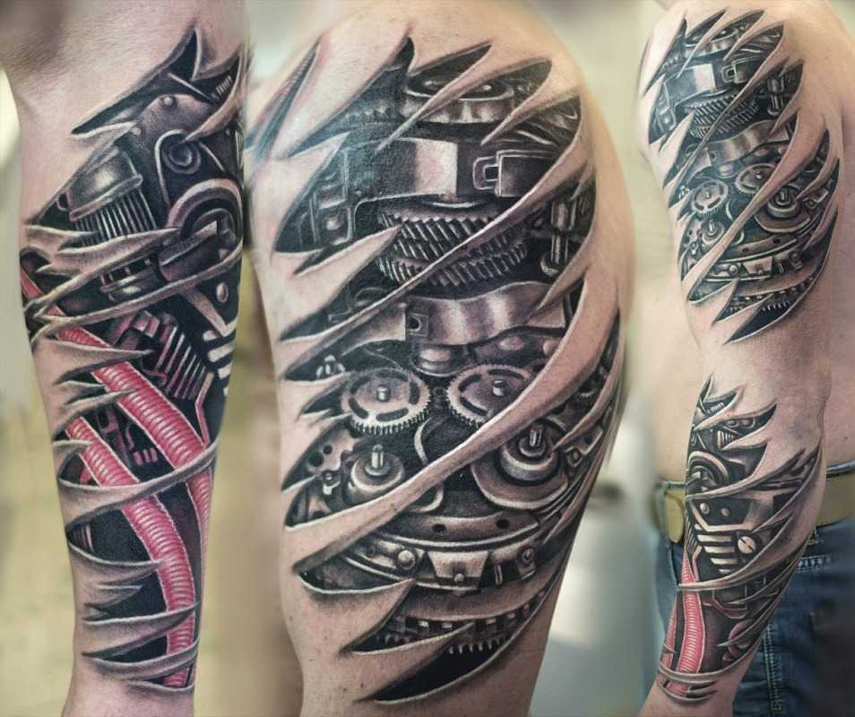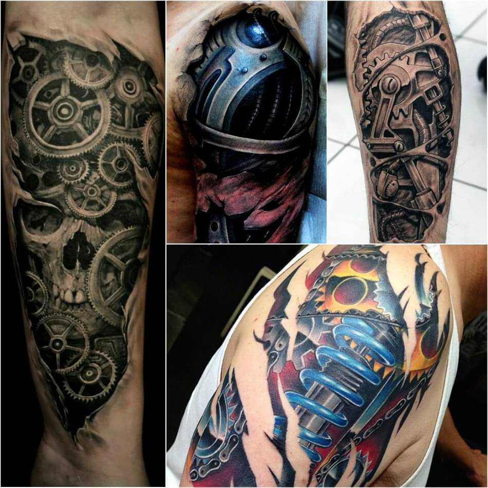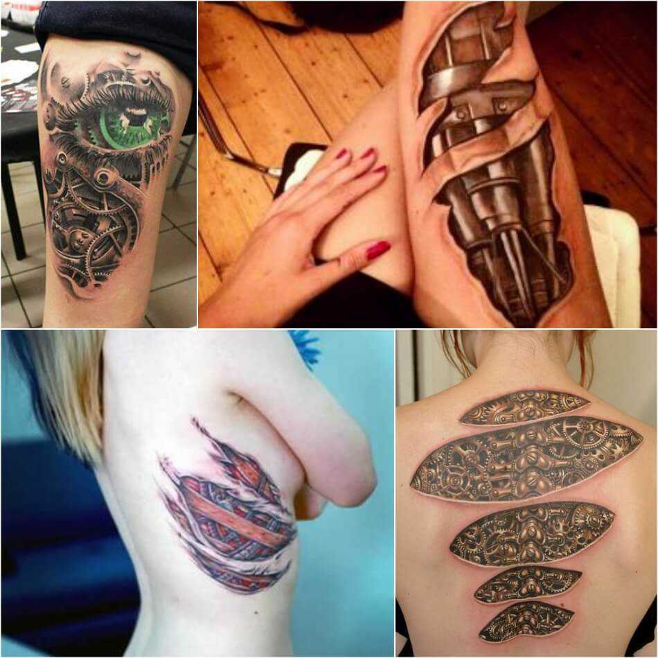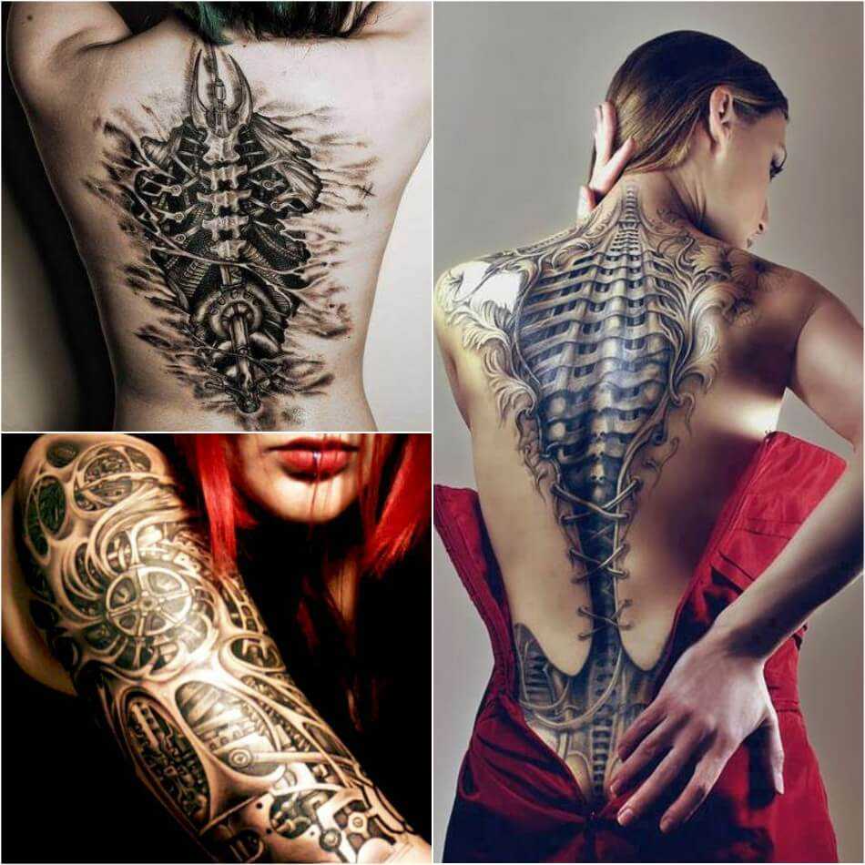 Стиль биомеханической татуировки включает в себя рисунки, которые представляют собой бесшовное сочетание человека и машины. Это означает объединение костей и тканей с шестернями, поршнями и другими механическими элементами в одном дизайне, создающими иллюзию киборгоподобной природы.