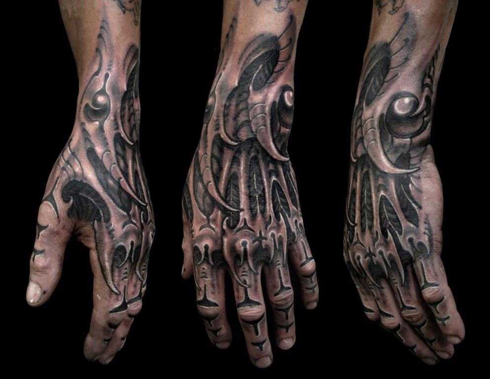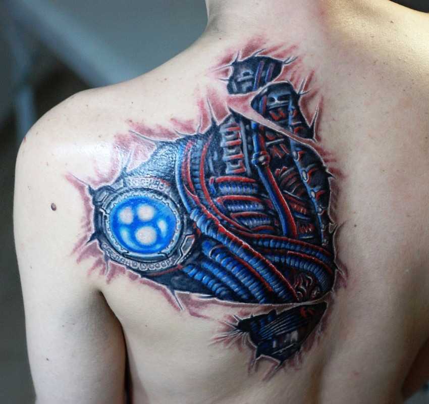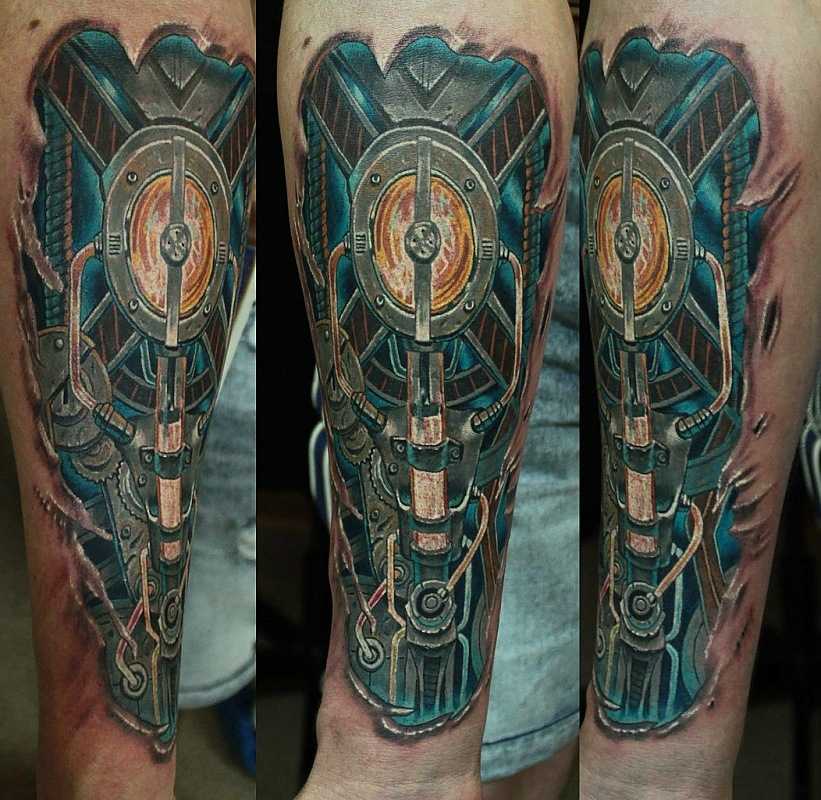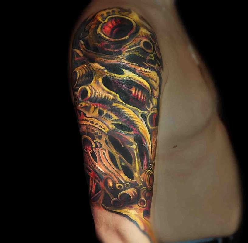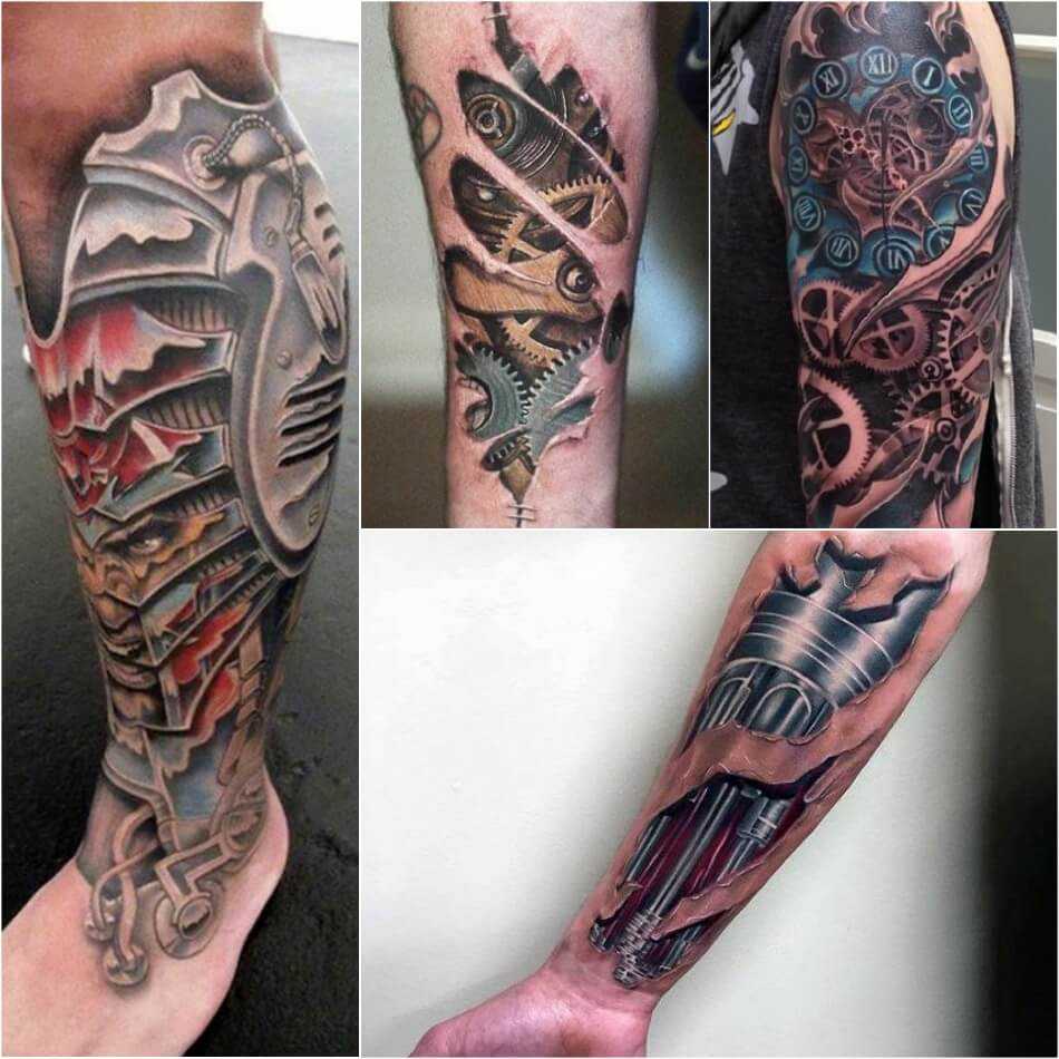 Стиль биомеханической татуировки включает в себя рисунки, которые представляют собой бесшовное сочетание человека и машины. Это означает объединение костей и тканей с шестернями, поршнями и другими механическими элементами в одном дизайне, создающими иллюзию киборгоподобной природы.