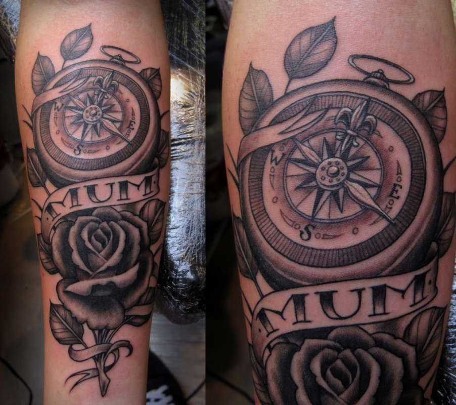 Мужские татуировки с розами на плече зачастую комбинируются с другими изображениями: часы, черепа, животные. Роза ветров выбор многих мужчин.