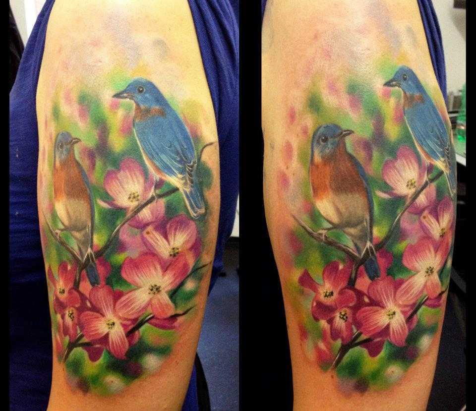 Нью скул. Эти наколки выбирают самые смелые и экстраординарные личности. Ветка, набитая в данном стиле, всегда будет выглядеть ярко и красочно, всем своим видом вызывая позитивные эмоции у своего обладателя и окружающих его людей.