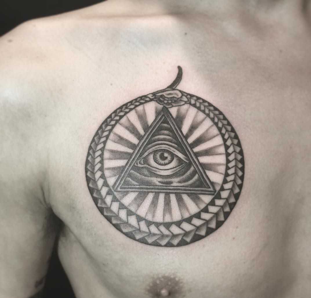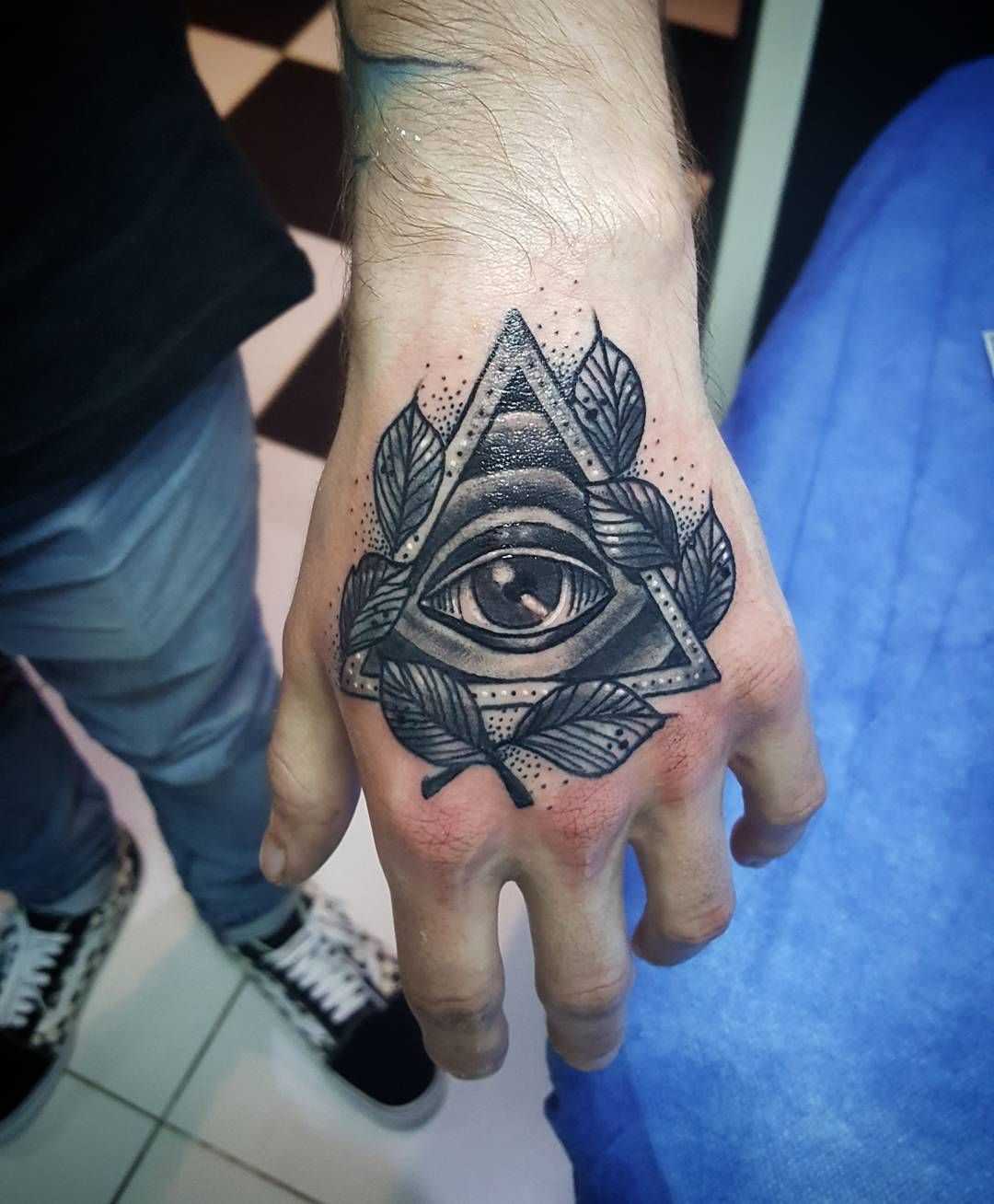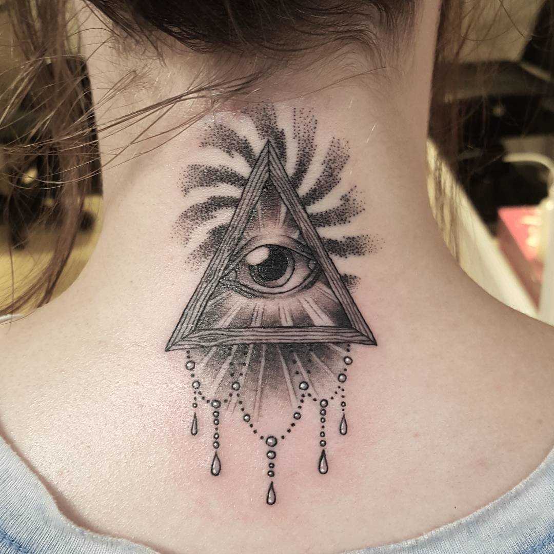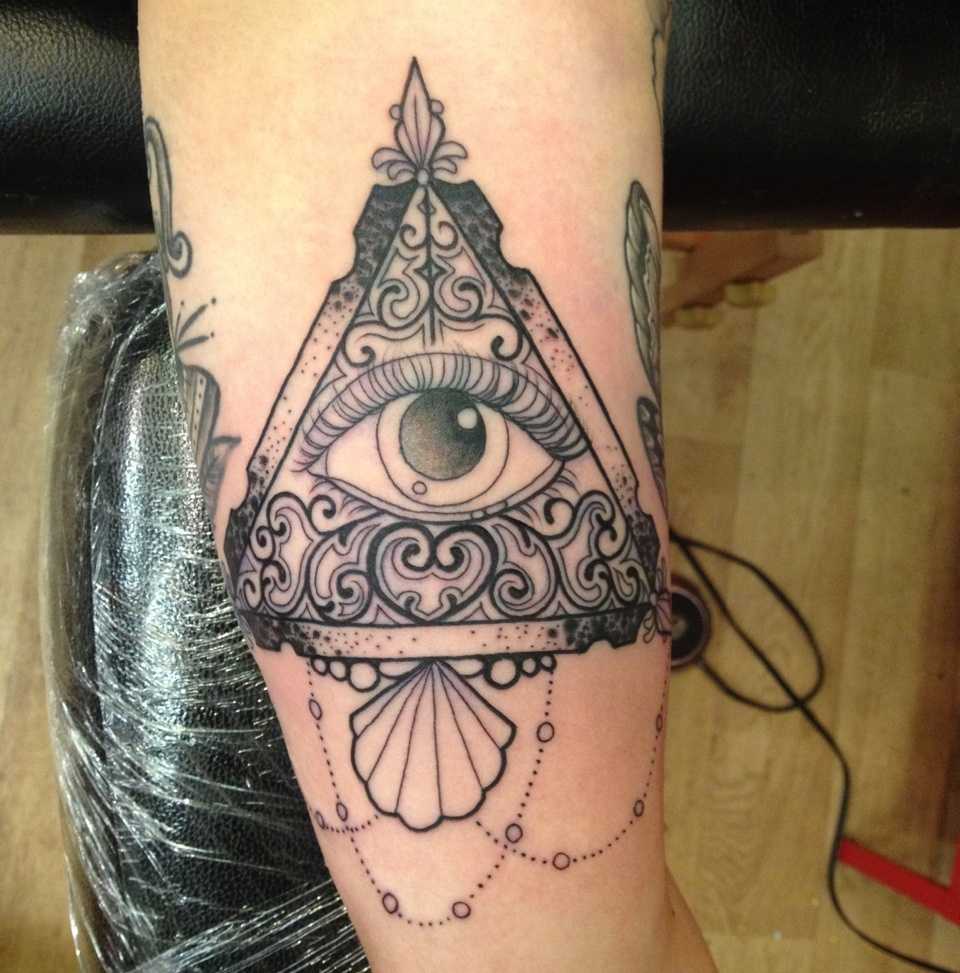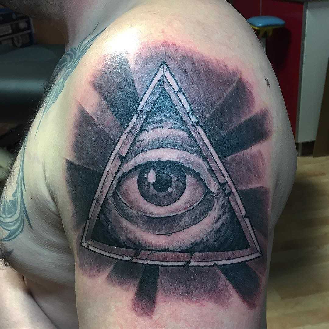 Глаз в треугольнике – путь к просветлению, озарению и умственному развитию, в тоже время символизирует человеческую дальновидность, осторожность и бдительность. Если коснуться религиозной тематики, то тату символизирует связь 3 этапов времени: будущее, настоящее и прошлое.