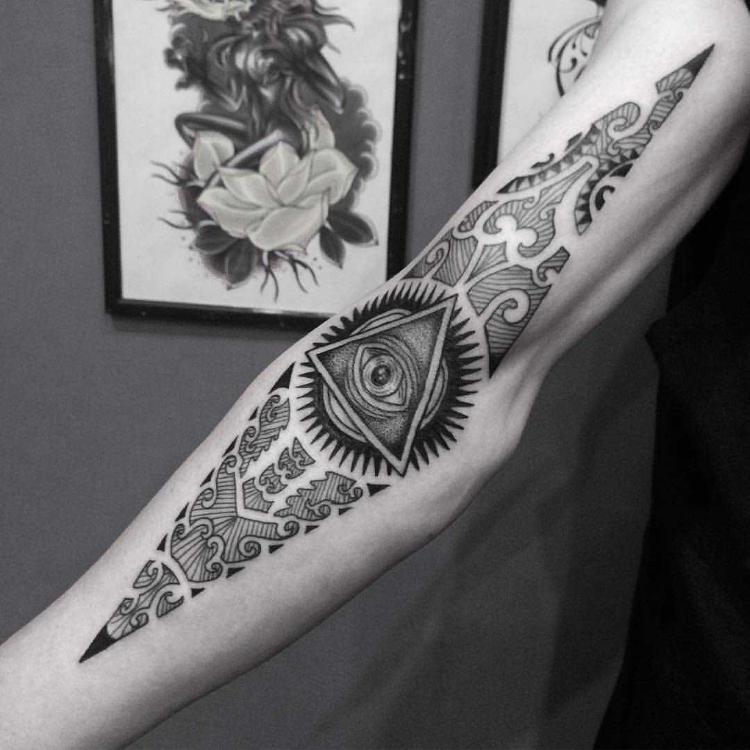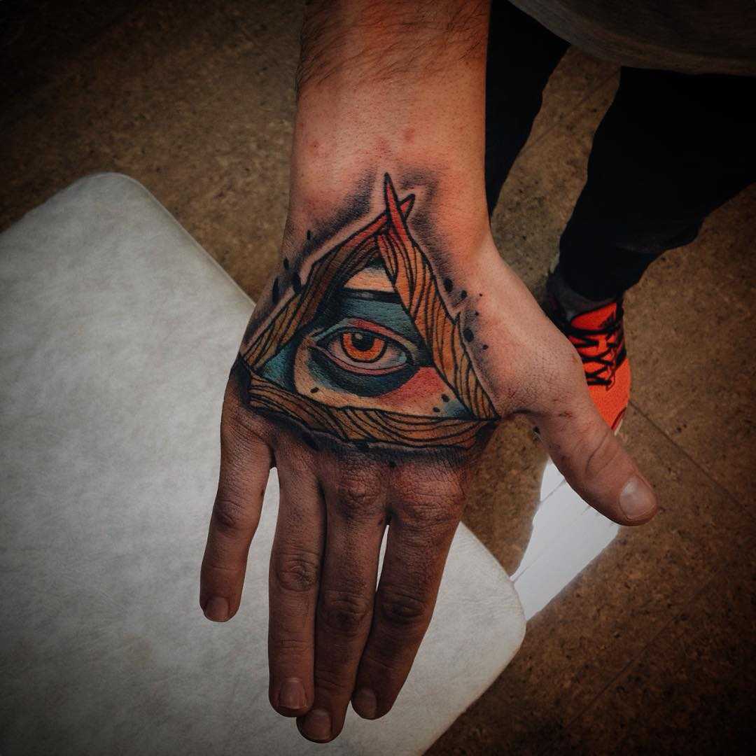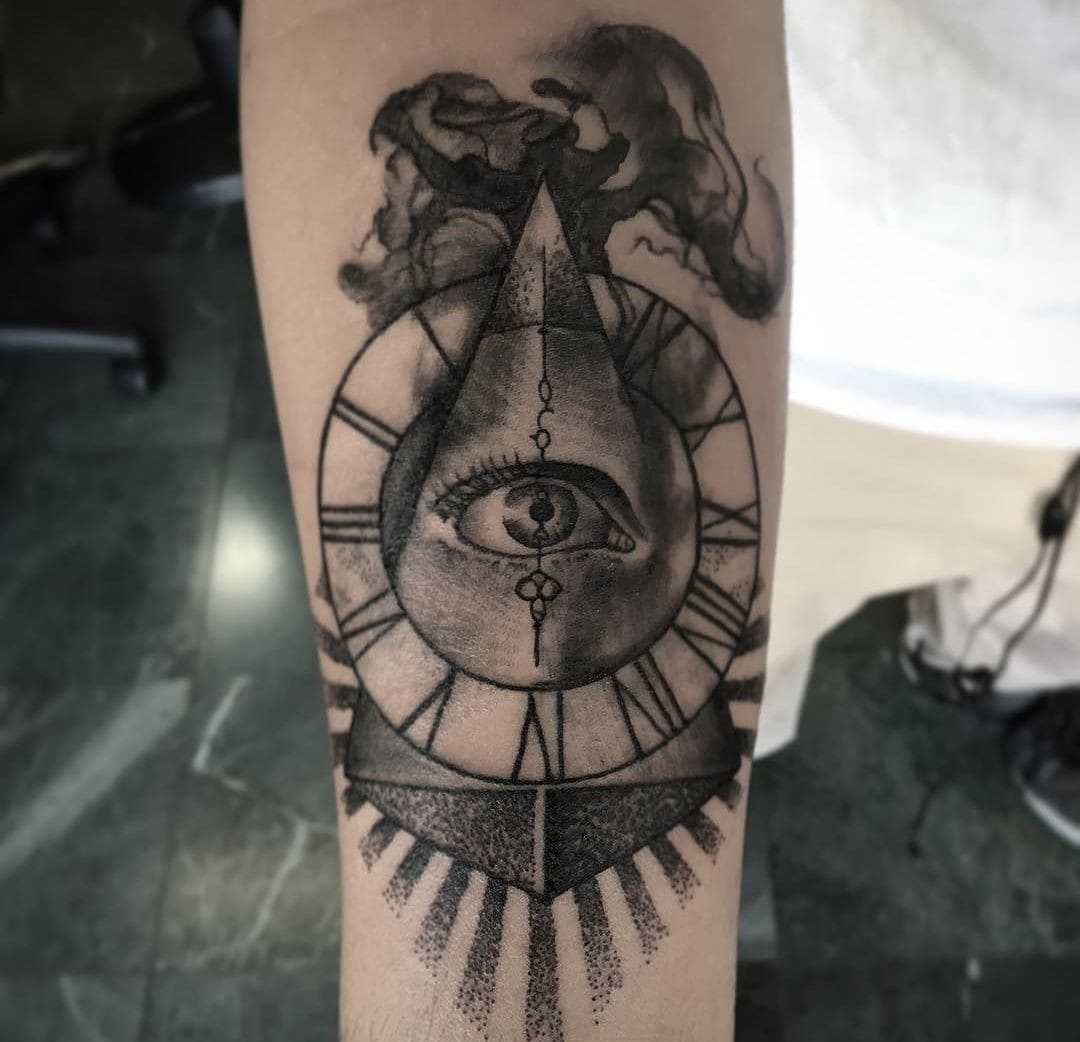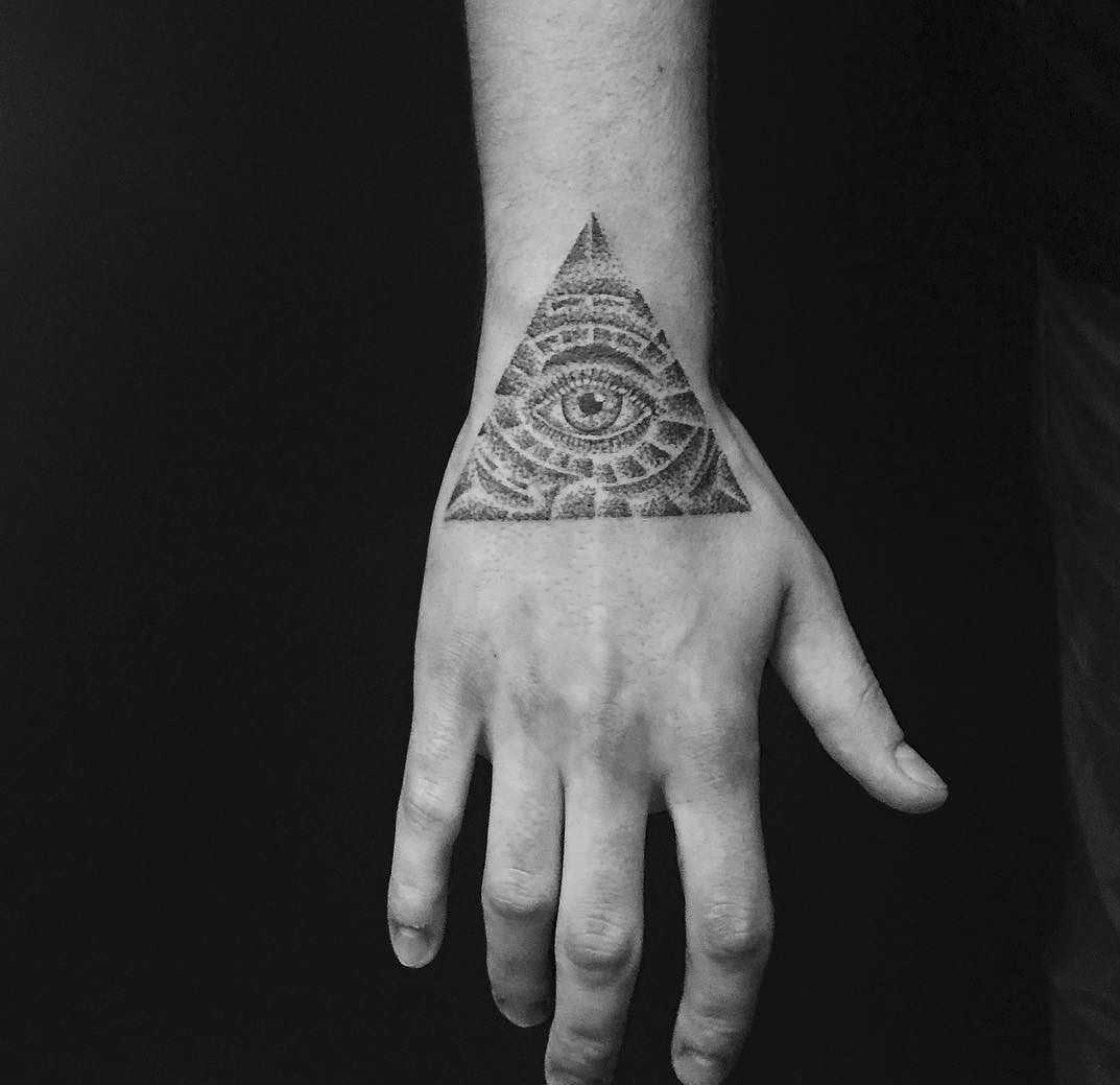 Глаз в треугольнике – путь к просветлению, озарению и умственному развитию, в тоже время символизирует человеческую дальновидность, осторожность и бдительность. Если коснуться религиозной тематики, то тату символизирует связь 3 этапов времени: будущее, настоящее и прошлое.