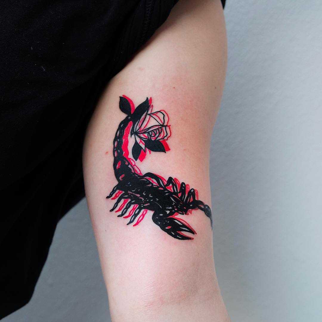 Треш-полька Еще один замечательный стиль для мужских татуировок. Он яркий, контрастный, насыщенный и дерзкий. Характерен сочетанием двух цветов — красного и черного. Изображения дополняются мазками, пятнами, точками, неаккуратными мазками, которые сделаны будто случайно. Для девушек такой стиль может быть грубоват, особенно, если речь идет об изображения скорпиона. А вот представителям сильной половины человечества эта татуировка будет как нельзя кстати.