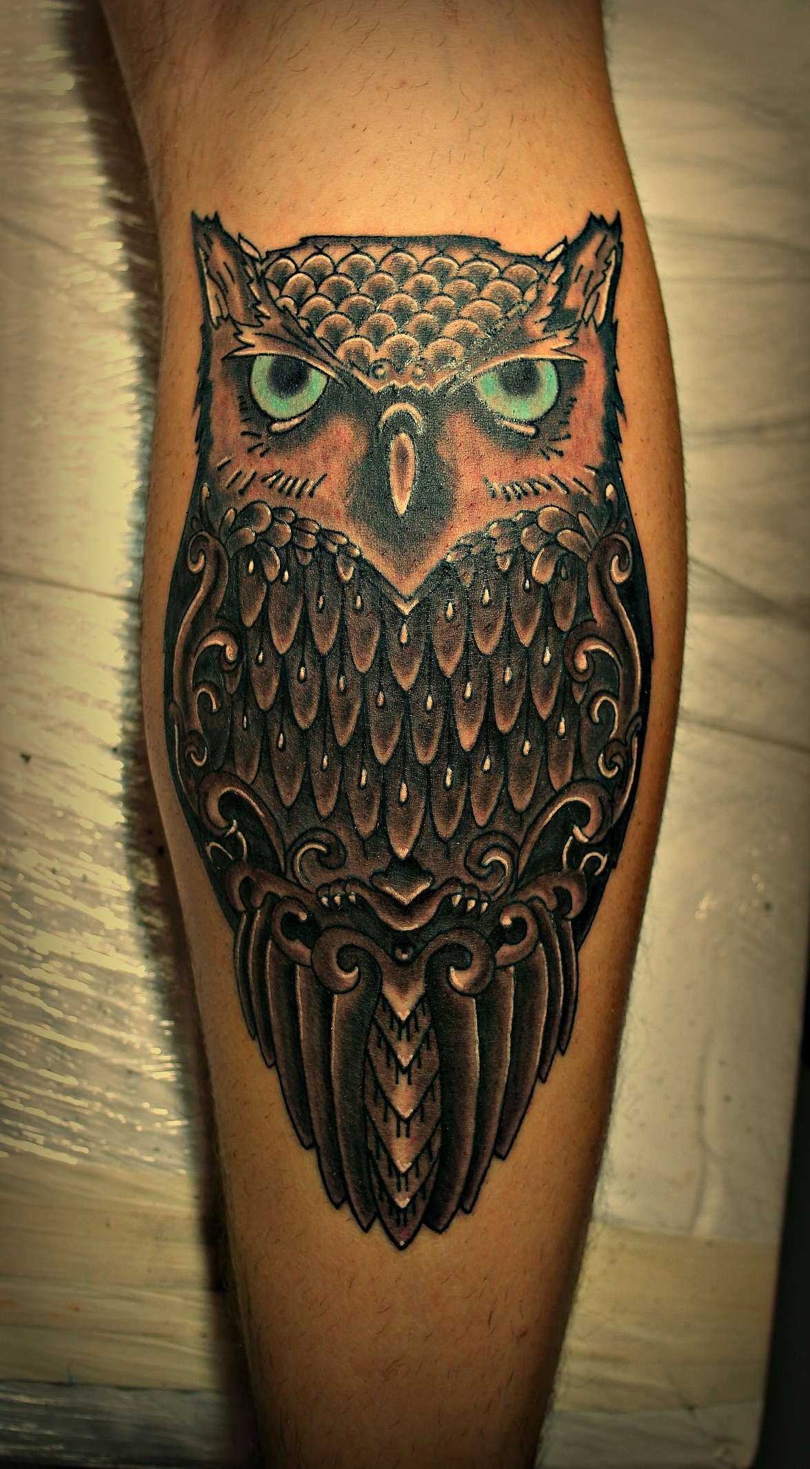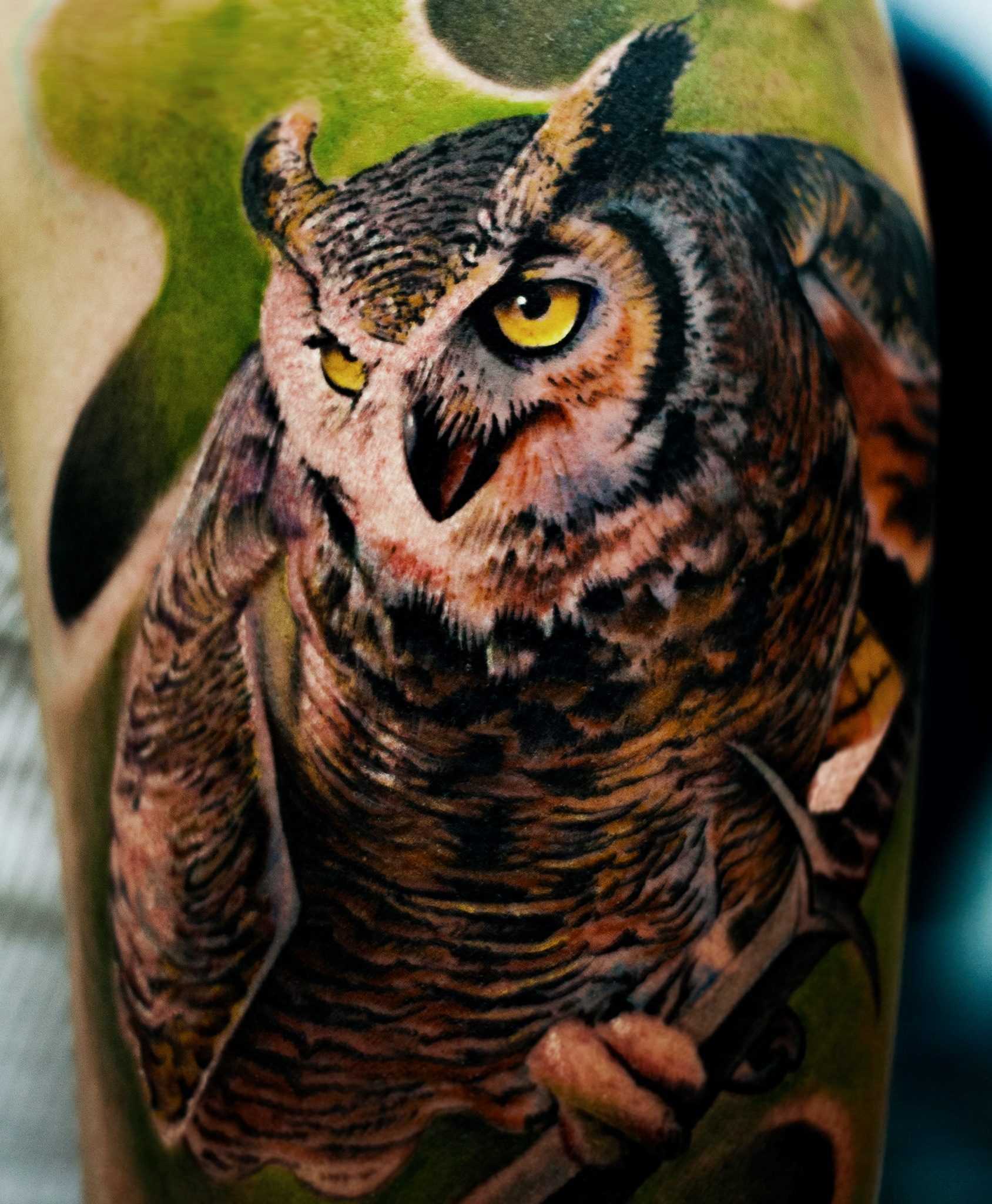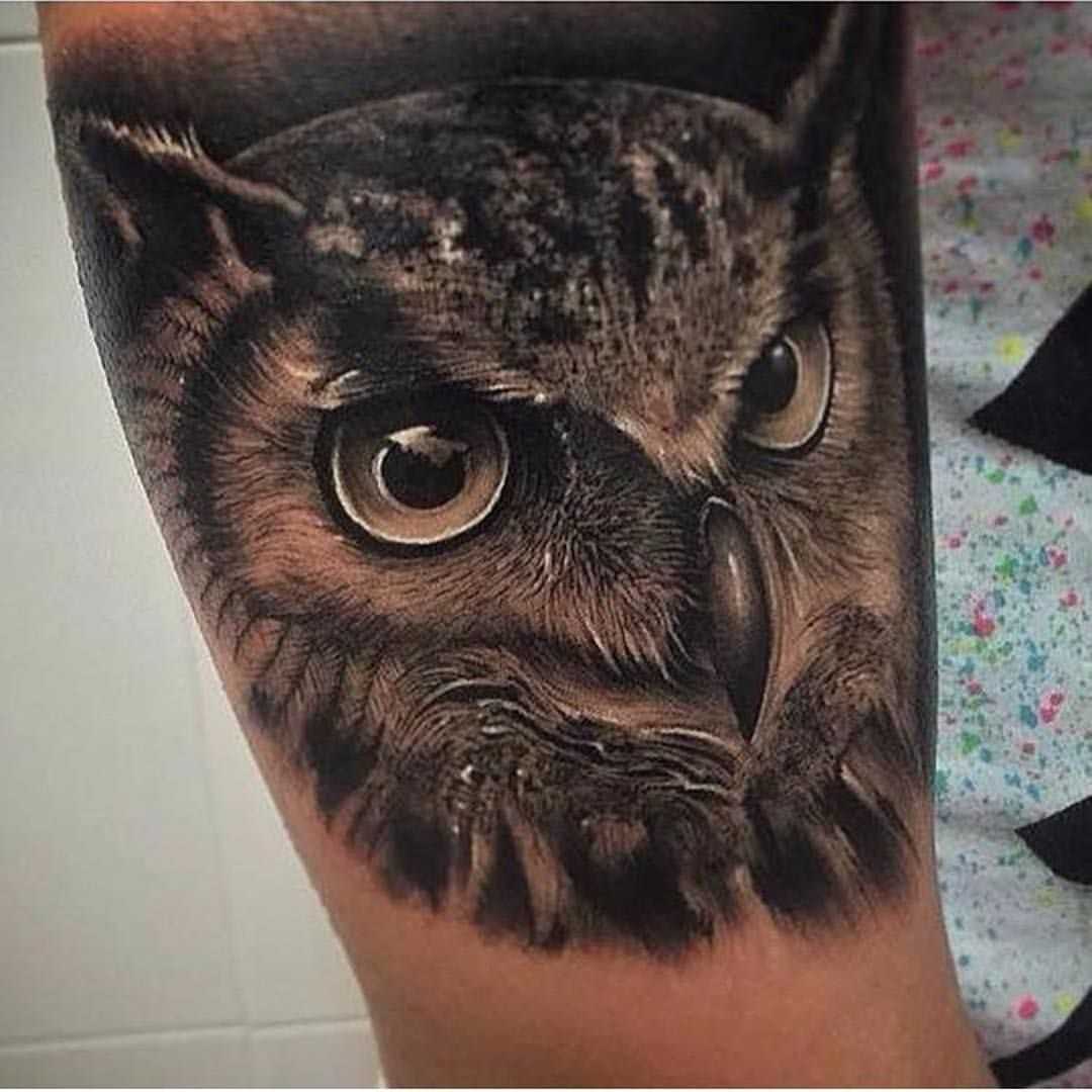 Реалистичность рисунка подчеркивается с помощью глубины и насыщенности цвета, теней и полутеней, которые делают тату объемным и кажется, что сова заглядывает прямо в душу.